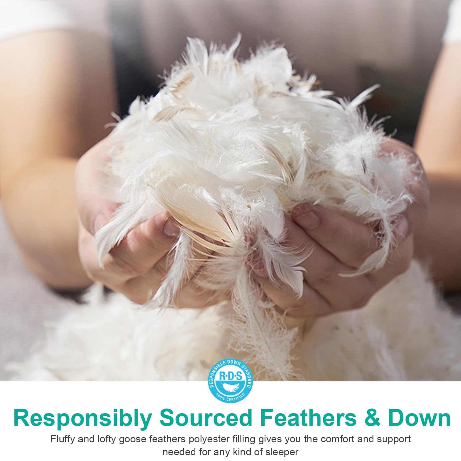 Es bietet eine perfekte Balance aus Weichheit und Stützkraft. Die äusseren Kammern mit daunenähnlichem Polyester sorgen für ein luxuriös weiches Gefühl, während die innere Kammer mit RDS-zertifizierten Federn sanften Widerstand leistet. Ihr Kopf wird gestützt, ohne zu tief einzusinken, was einer mittelfesten Stützkraft entspricht.