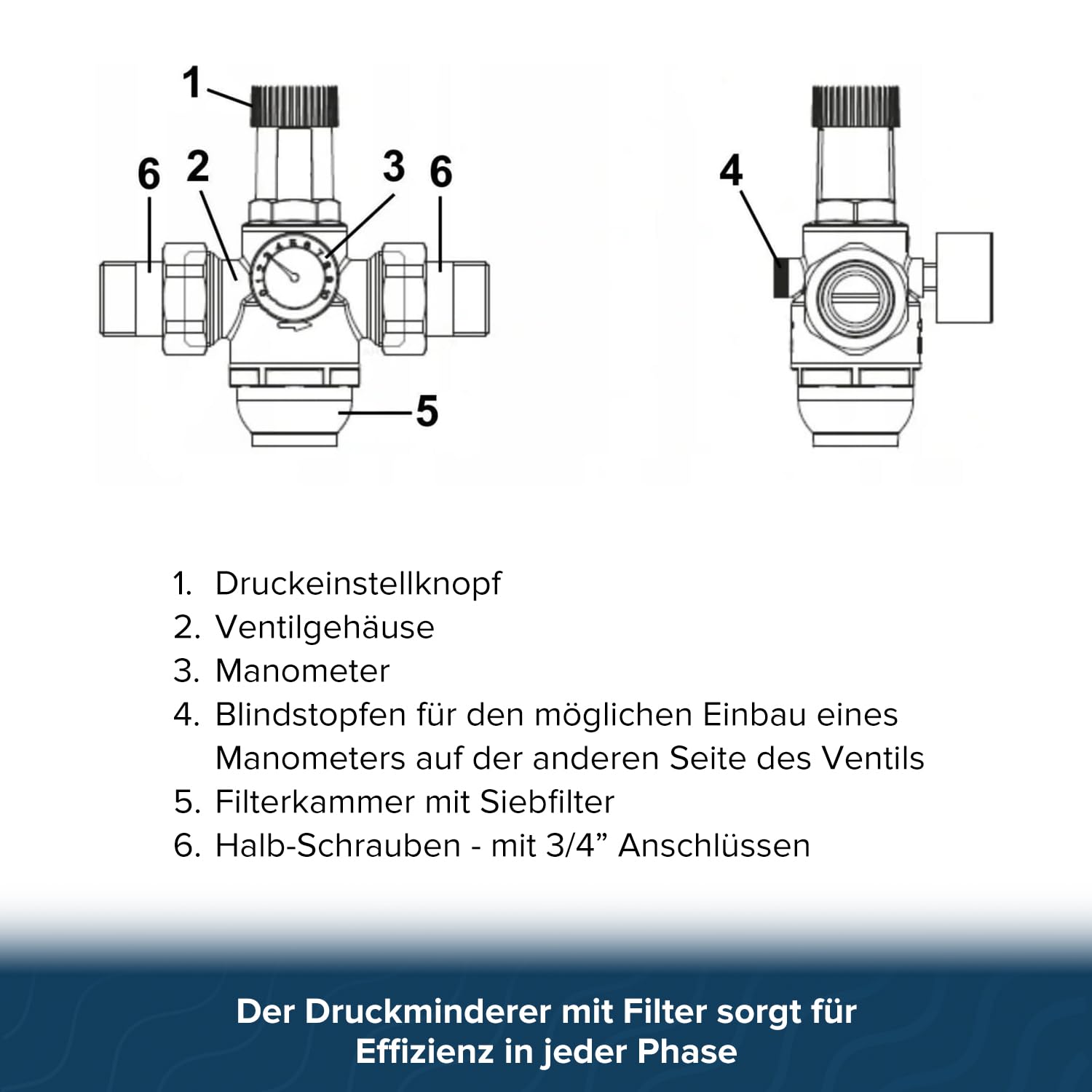 - Anschlüsse: 3/4-Zoll mit passenden Halbschrauben