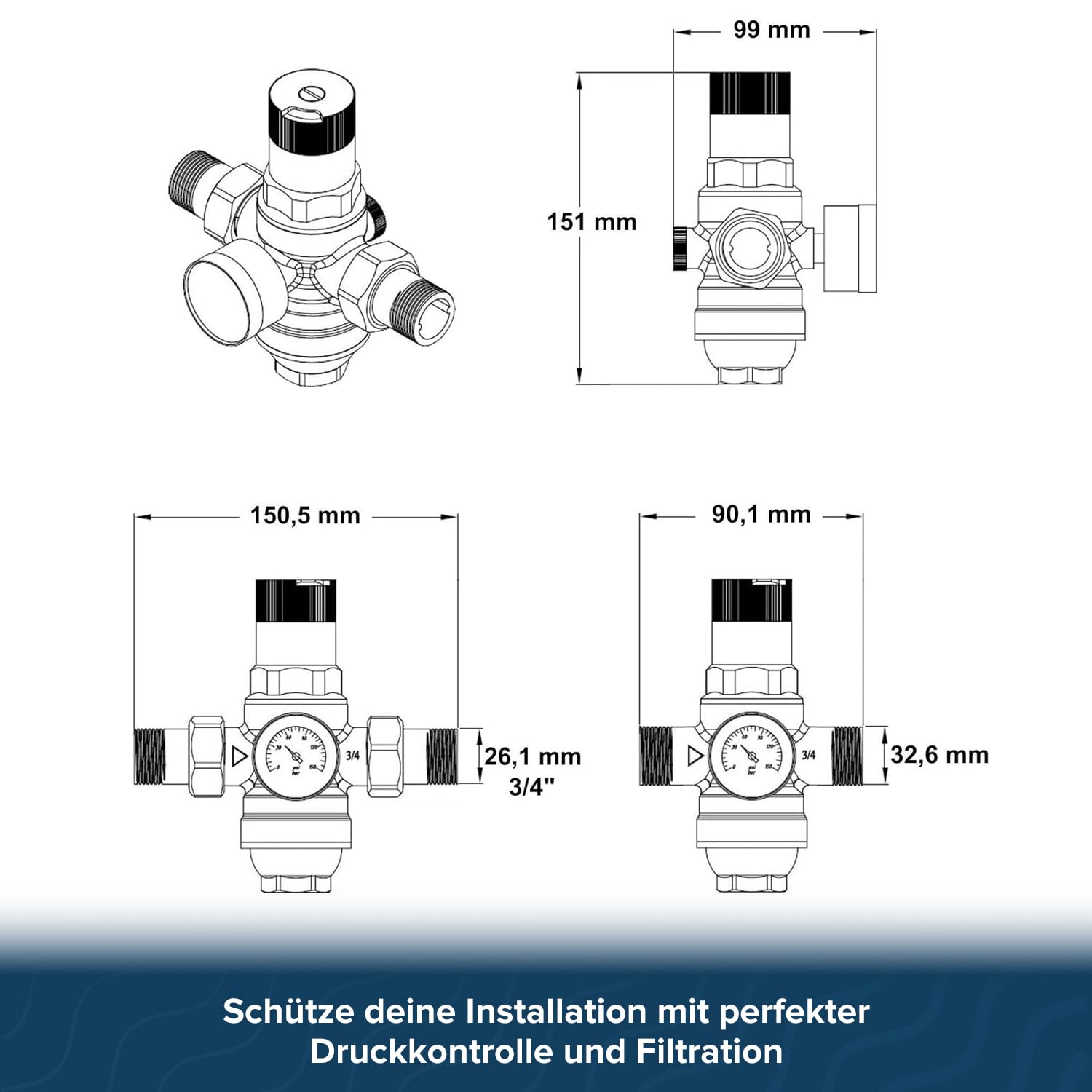 Ein Druckminderer schützt Ihre Wasserleitungen und angeschlossenen Geräte wie Waschmaschinen oder Boiler zuverlässig vor Schäden durch zu hohen Wasserdruck aus dem öffentlichen Netz. Er sorgt für einen konstanten, optimalen Druck, reduziert Wassergeräusche und kann helfen, den Wasserverbrauch zu senken.