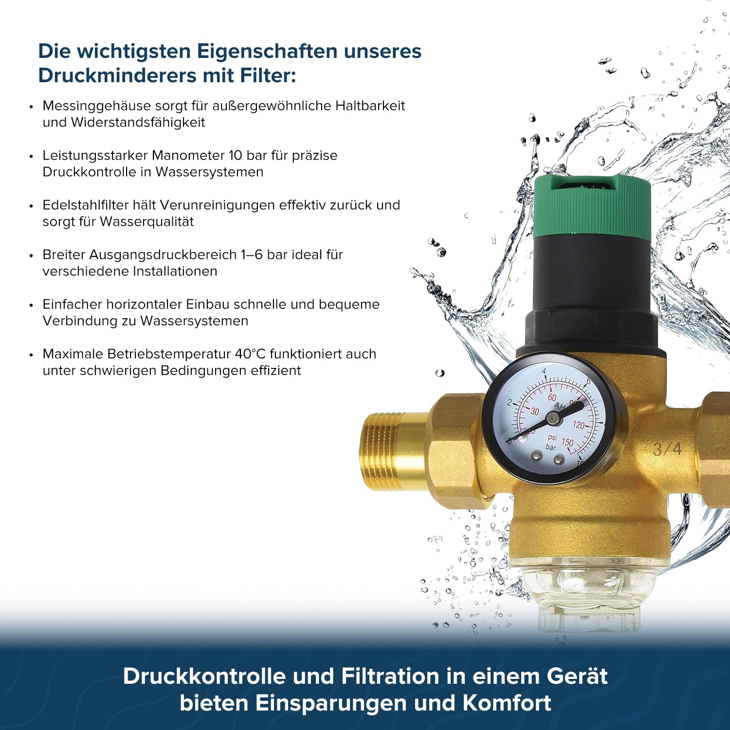Dieser Druckminderer von AQUA HEATING reguliert zuverlässig den Wasserdruck in Ihrem System. Gefertigt aus hochwertigem Messing und ausgestattet mit einem Manometer, sorgt er für einen konstanten Druck und schützt Ihre Installationen vor Schäden durch Überdruck.