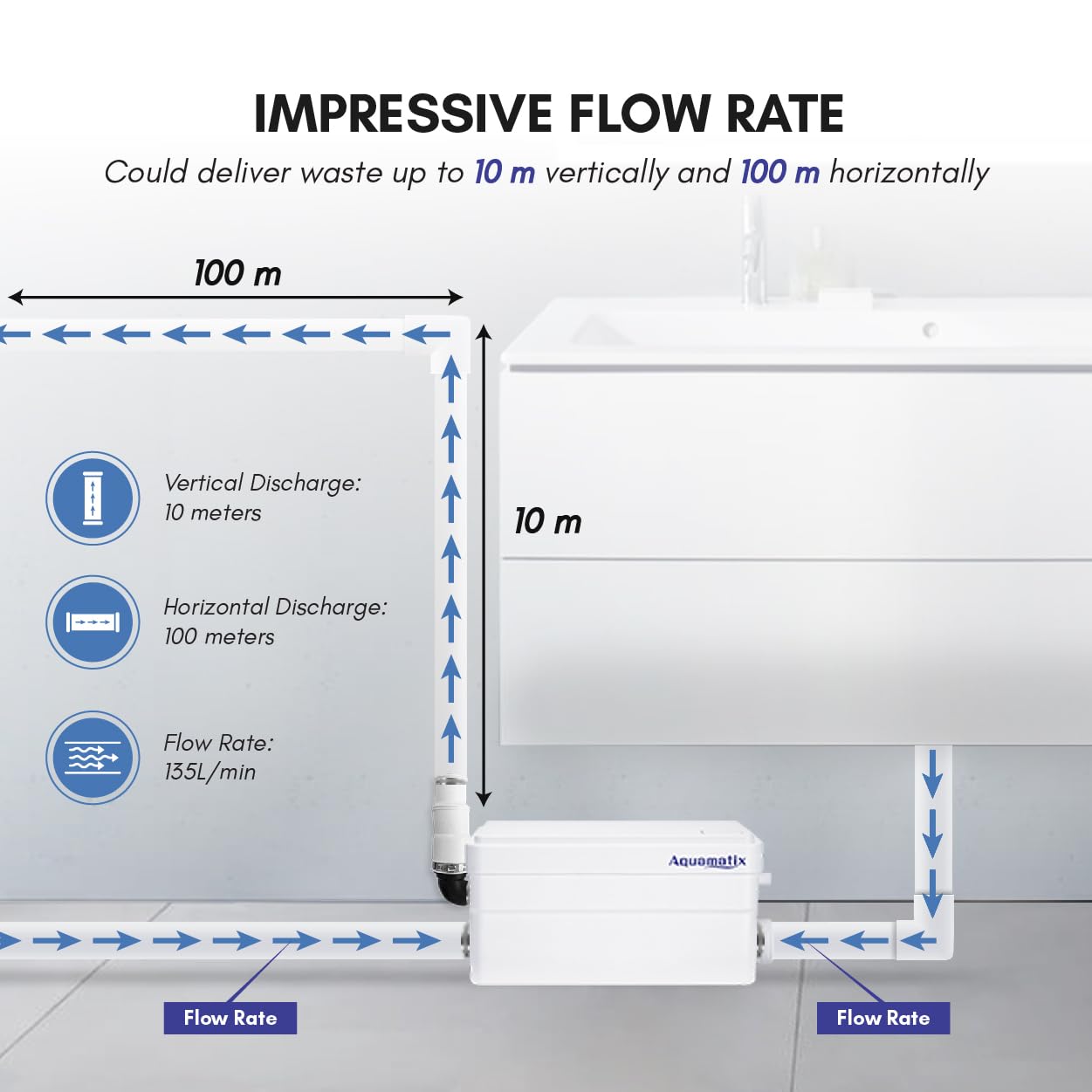 Die leistungsstarke 250-Watt-Pumpe befördert Abwasser bis zu 10 Meter hoch (vertikal) und bis zu 100 Meter weit (horizontal). Dies ermöglicht eine flexible Installation, auch wenn das Fallrohr weit entfernt ist.