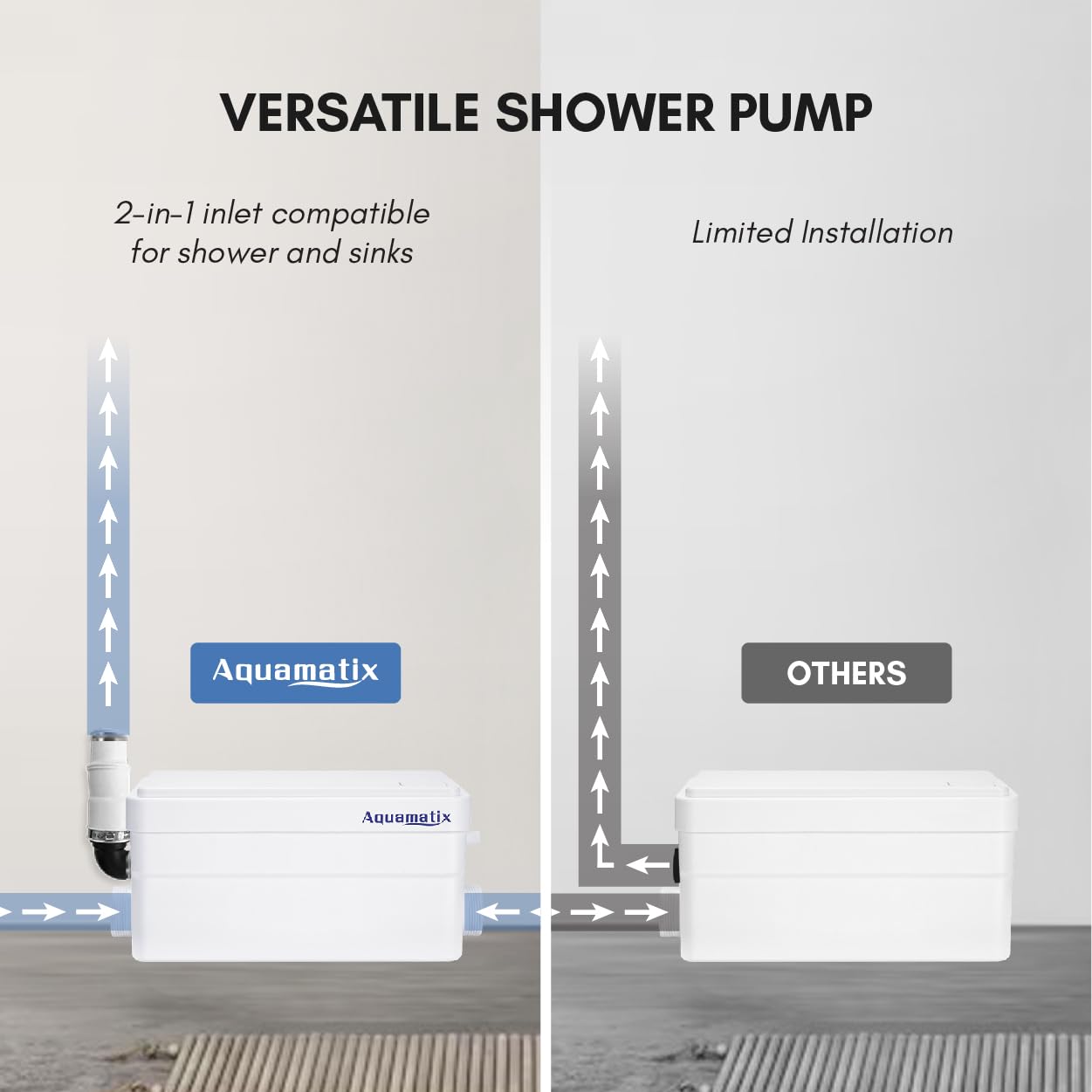 Die Aquamatix Duscha ist eine kompakte und leistungsstarke Hebeanlage, die speziell für die effiziente Abwasserentsorgung von Duschen und Waschbecken in Ihrem Haushalt konzipiert wurde. Sie bietet eine zuverlässige Lösung, um Abwasser auch dort abzuleiten, wo ein direkter Anschluss an das Fallrohr nicht möglich ist.