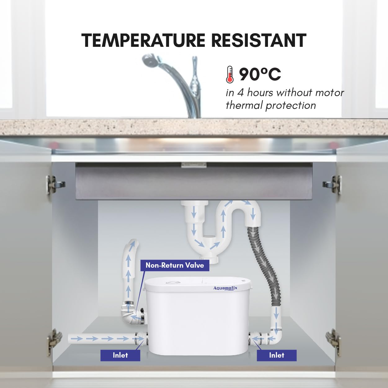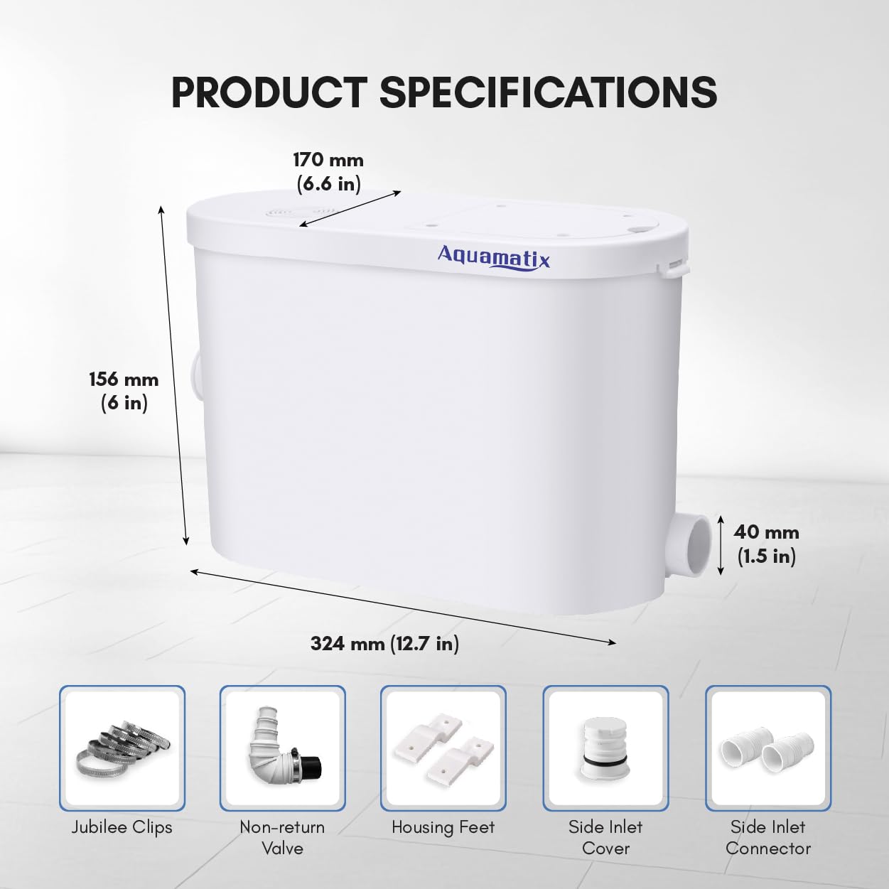 Die Aquamatix Silencio 2 ist eine leistungsstarke und leise Hebeanlage, die Abwasser von Duschen, Waschbecken und Waschmaschinen zuverlässig und effizient ableitet, auch an Orten ohne direkten Zugang zum Hauptabwasserrohr.
