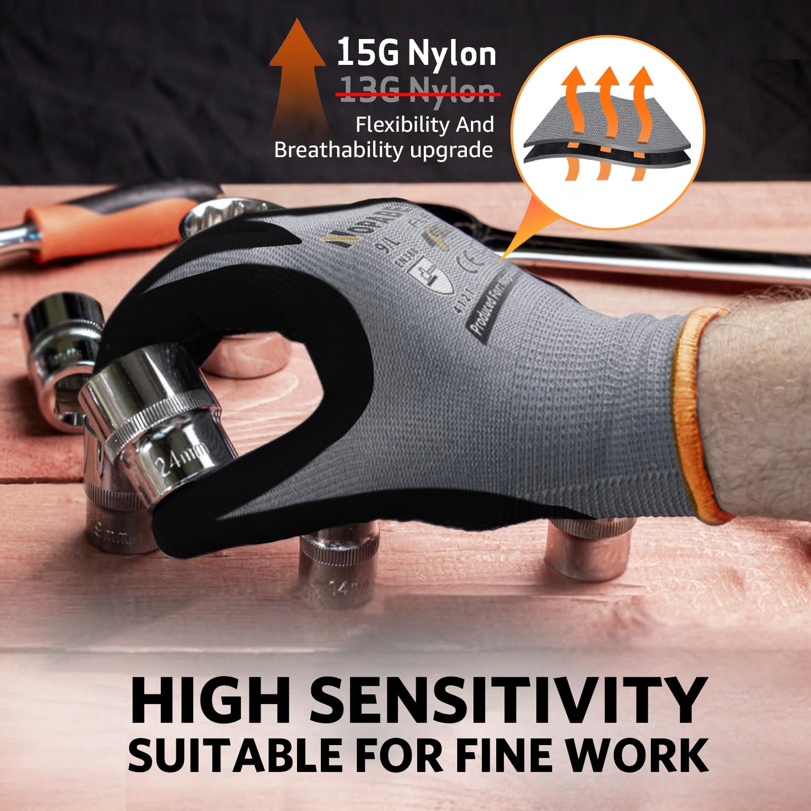 - Hervorragender Grip: Die widerstandsfähige Nitrilbeschichtung sorgt für eine aussergewöhnliche Rutschfestigkeit. Die Handschuhe bleiben sowohl bei trockenen als auch bei öligen Oberflächen zuverlässig griffig, auch nach intensiver Nutzung.