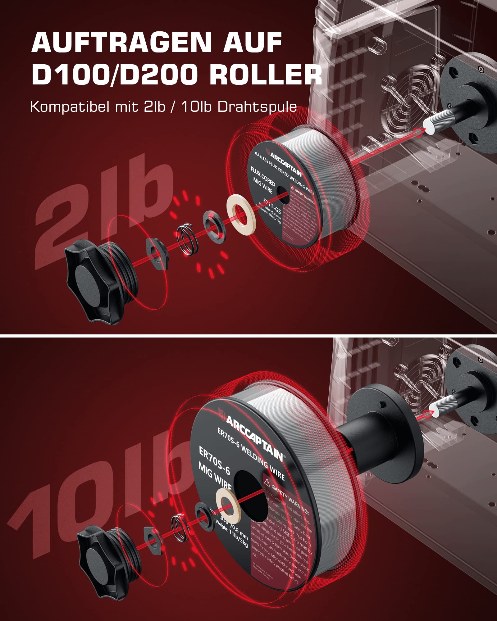 Das Schweissgerät ist flexibel konzipiert und kann sowohl kleine 1-kg-Drahtrollen (D100) als auch grosse 5-kg-Drahtrollen (D200) aufnehmen. Dies ermöglicht den Einsatz für kleine Reparaturen ebenso wie für grössere Projekte ohne ständigen Spulenwechsel.