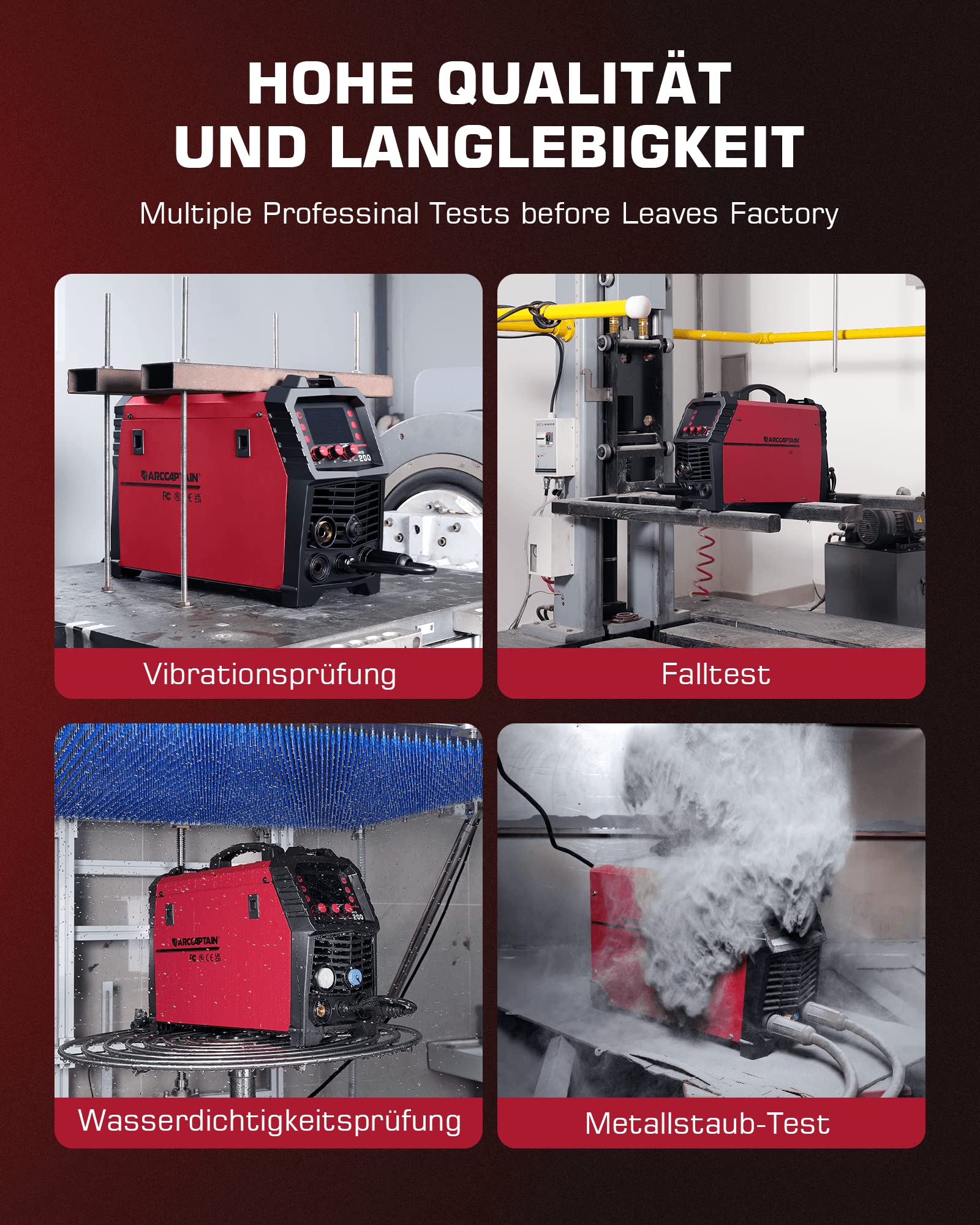 Geprüfte Qualität und Langlebigkeit: Dieses Schweissgerät wurde rigorosen Tests unterzogen, darunter Vibrations-, Fall- und Wasserdichtigkeitstests (TÜV & CSA zertifiziert). Die Verwendung hochwertiger Komponenten sichert maximale Stabilität und eine lange Lebensdauer, unterstützt durch eine 2-jährige Qualitätsgarantie.