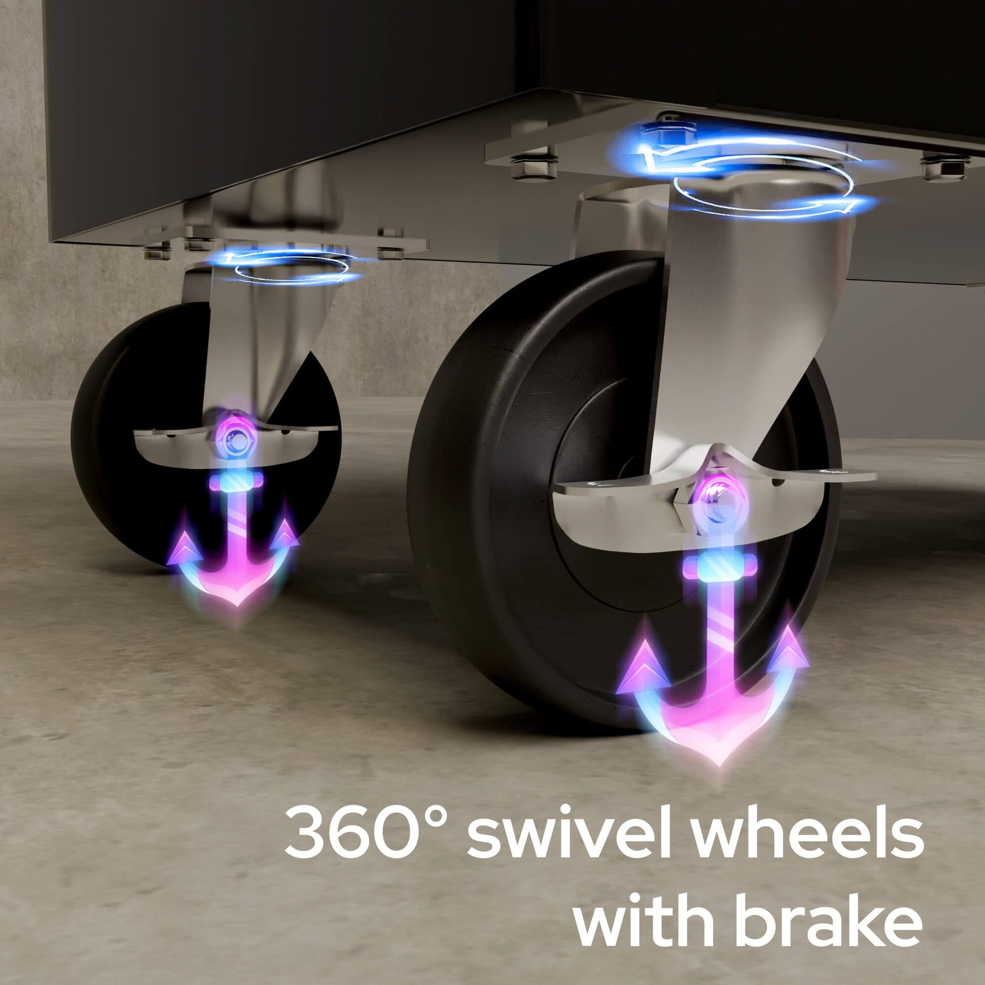 Maximale Mobilität und Stabilität: Mit den vier robusten Rollen, von denen zwei lenkbar sind und über eine Feststellbremse verfügen, lässt sich der Wagen mühelos bewegen und sicher an der gewünschten Position parkieren. Der praktische Schiebegriff erleichtert das Manövrieren zusätzlich.