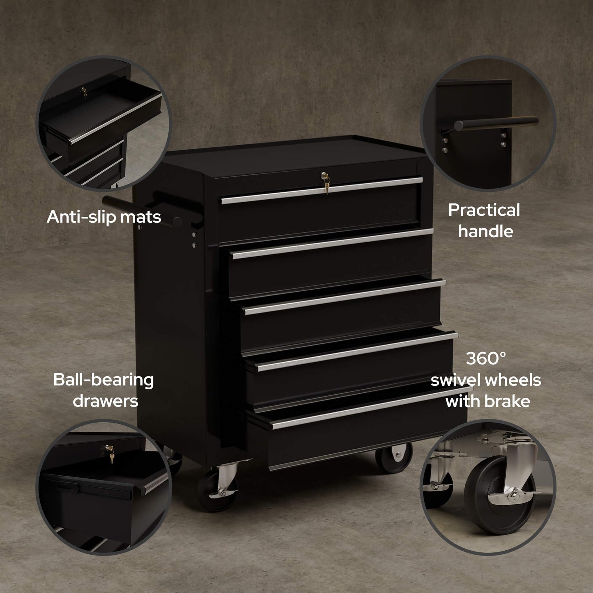 - Fünf geräumige Schubladen: Ausgestattet mit Antirutschmatten, damit Ihr Werkzeug sicher an seinem Platz bleibt und beim Verschieben nicht klappert.
