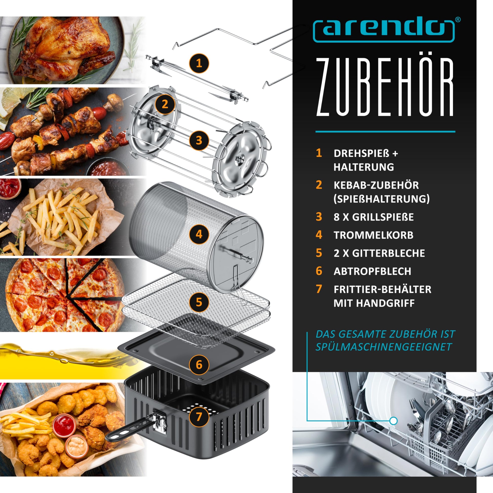 Entdecken Sie den Arendo FRY TIME, den multifunktionalen Küchenhelfer, der Heissluftfritteuse, Drehgrill und Dörrautomat in einem eleganten Gerät vereint. Bereiten Sie mühelos vielfältige und gesunde Gerichte für die ganze Familie zu.