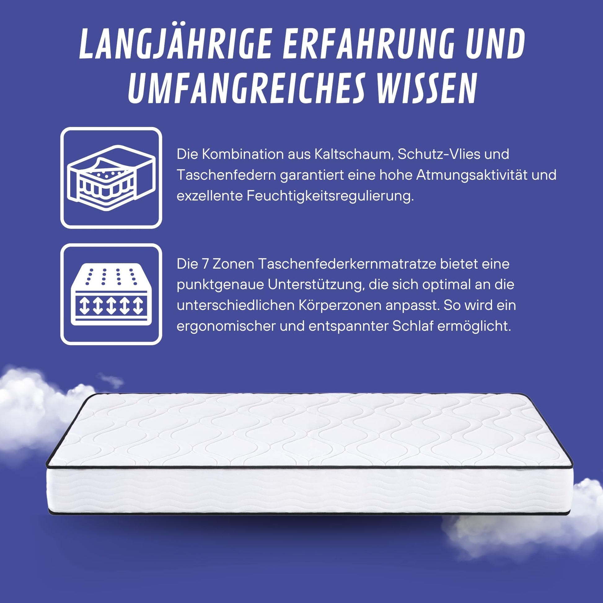 - Zonierung: 7 ergonomische Zonen zur gezielten Unterstützung von Schultern, Lendenwirbeln und Becken für eine korrekte Ausrichtung der Wirbelsäule.