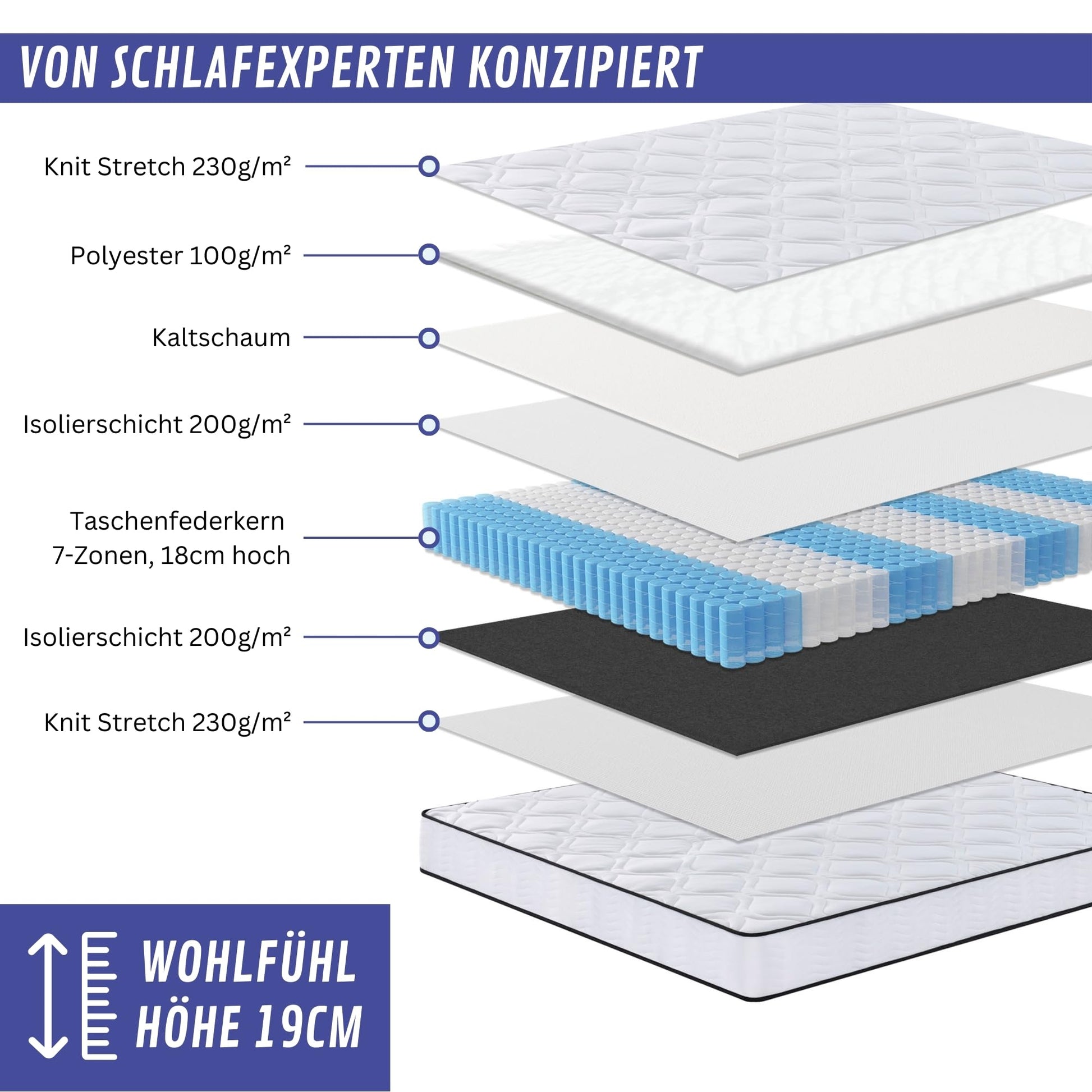 - Aufbau: Ein innovativer 6-Schichten-Aufbau mit einer komfortablen Gesamthöhe von 19 cm.