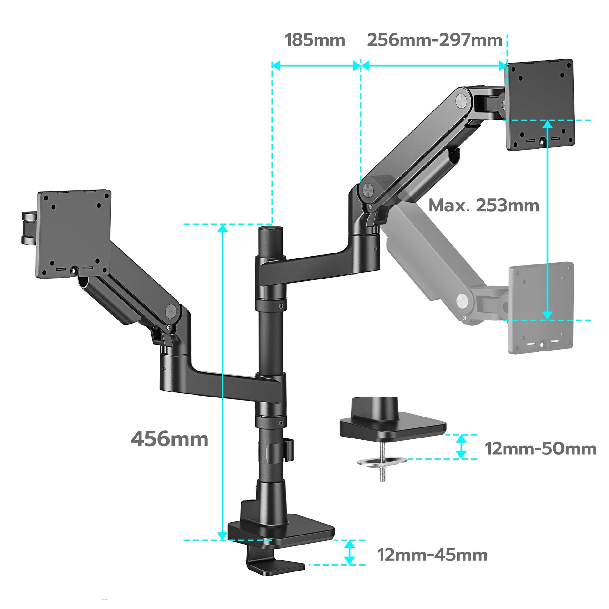 - Hohe Belastbarkeit: Jeder Arm trägt problemlos Monitore mit einem Gewicht von 2 bis 20 kg und eignet sich für Bildschirmgrössen von 17 bis 49 Zoll.