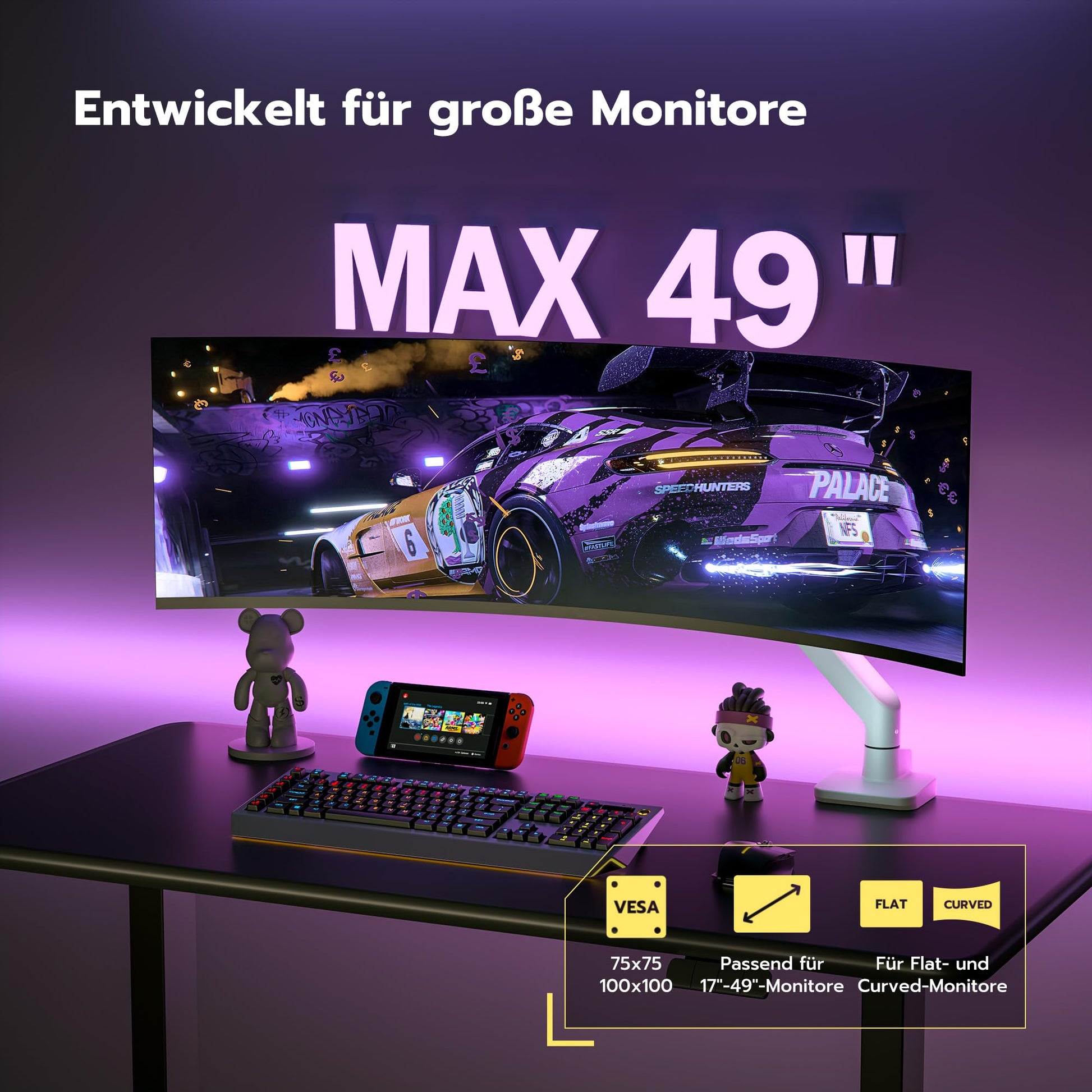- Breite Kompatibilität: Geeignet für flache und gebogene Bildschirme von 17 bis 49 Zoll mit einem Gewicht zwischen 2 und 20 kg. Ideal für grosse Monitore wie den Samsung Odyssey G9 oder andere Ultrabreitbild-Modelle.