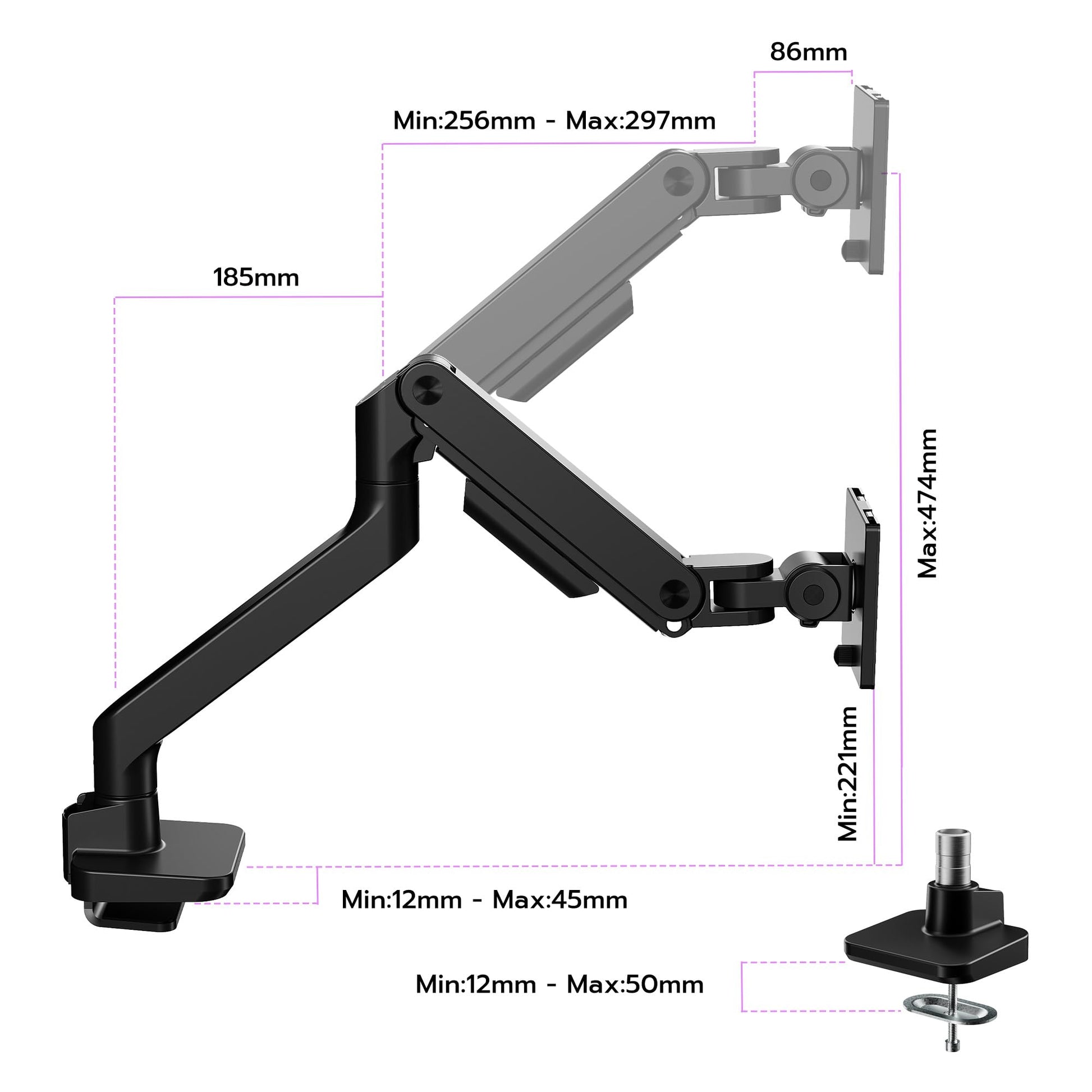 Die Installation ist einfach und erfordert kein Bohren. Sie können zwischen zwei Montageoptionen wählen: einer C-Klemme für Tischplatten von 12,5 bis 45 mm Dicke oder einer Tüllenhalterung (falls ein Loch vorhanden ist) für Platten von 12,5 bis 50 mm Dicke. Die abnehmbare VESA-Platte erleichtert das Anbringen des Monitors zusätzlich.