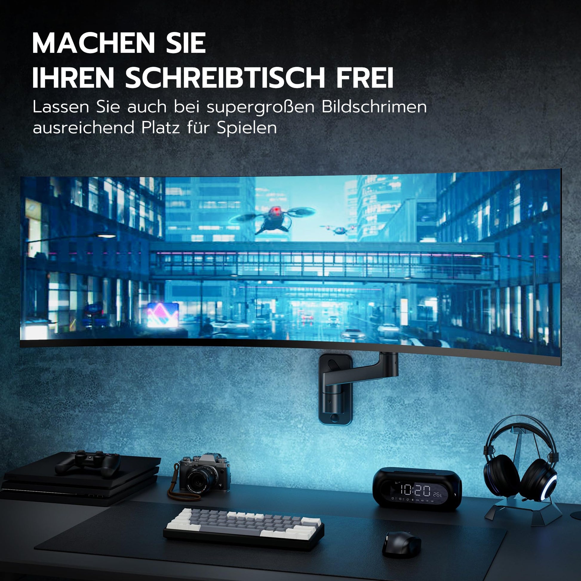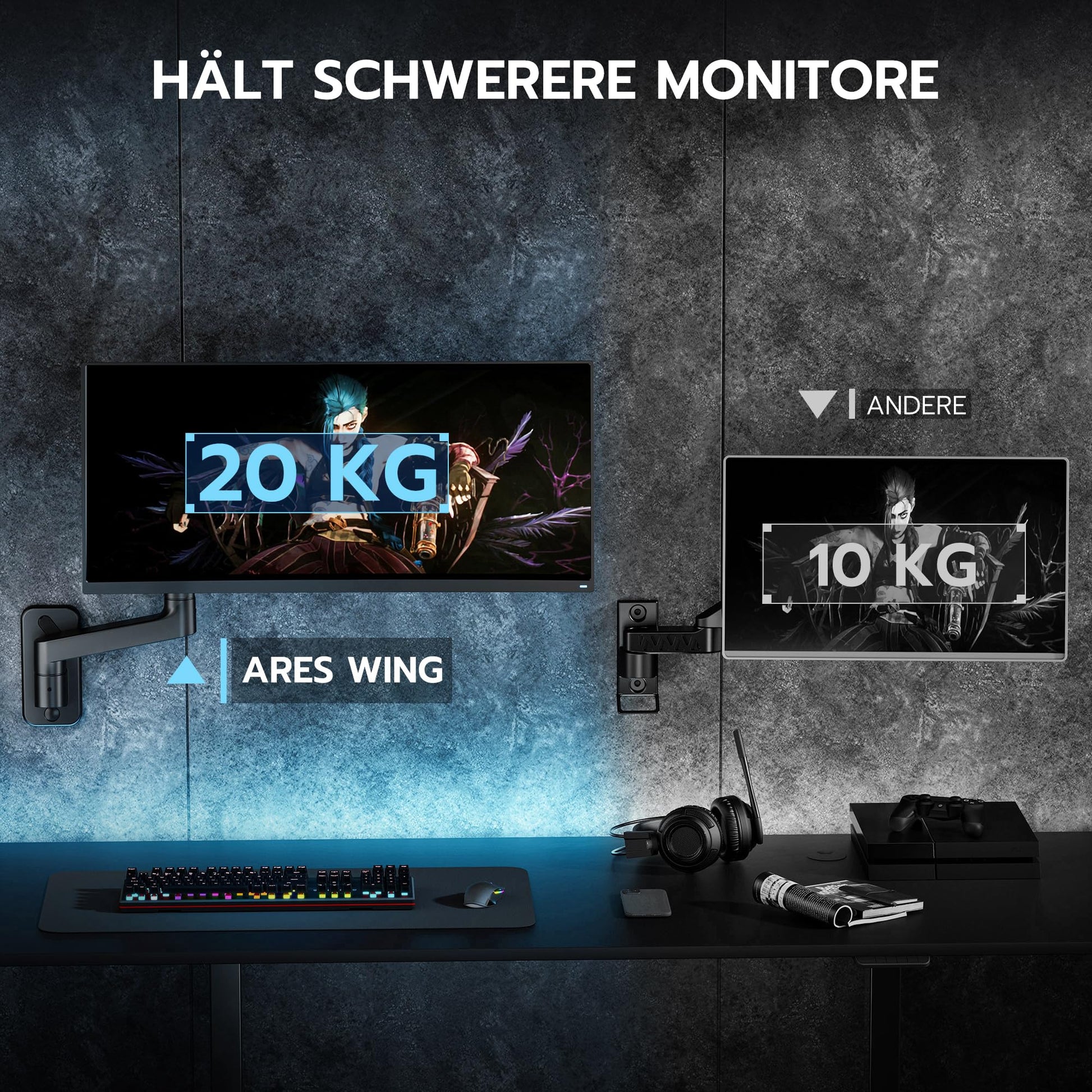 Ja, absolut. Die ARES WING Wandhalterung wurde speziell für grosse und schwere Bildschirme bis 49 Zoll und 20 kg entwickelt. Sie ist ideal für ultrabreite und stark gekrümmte (1000R) Monitore und bietet die nötige Stabilität und Flexibilität für ein optimales Gaming-Erlebnis.