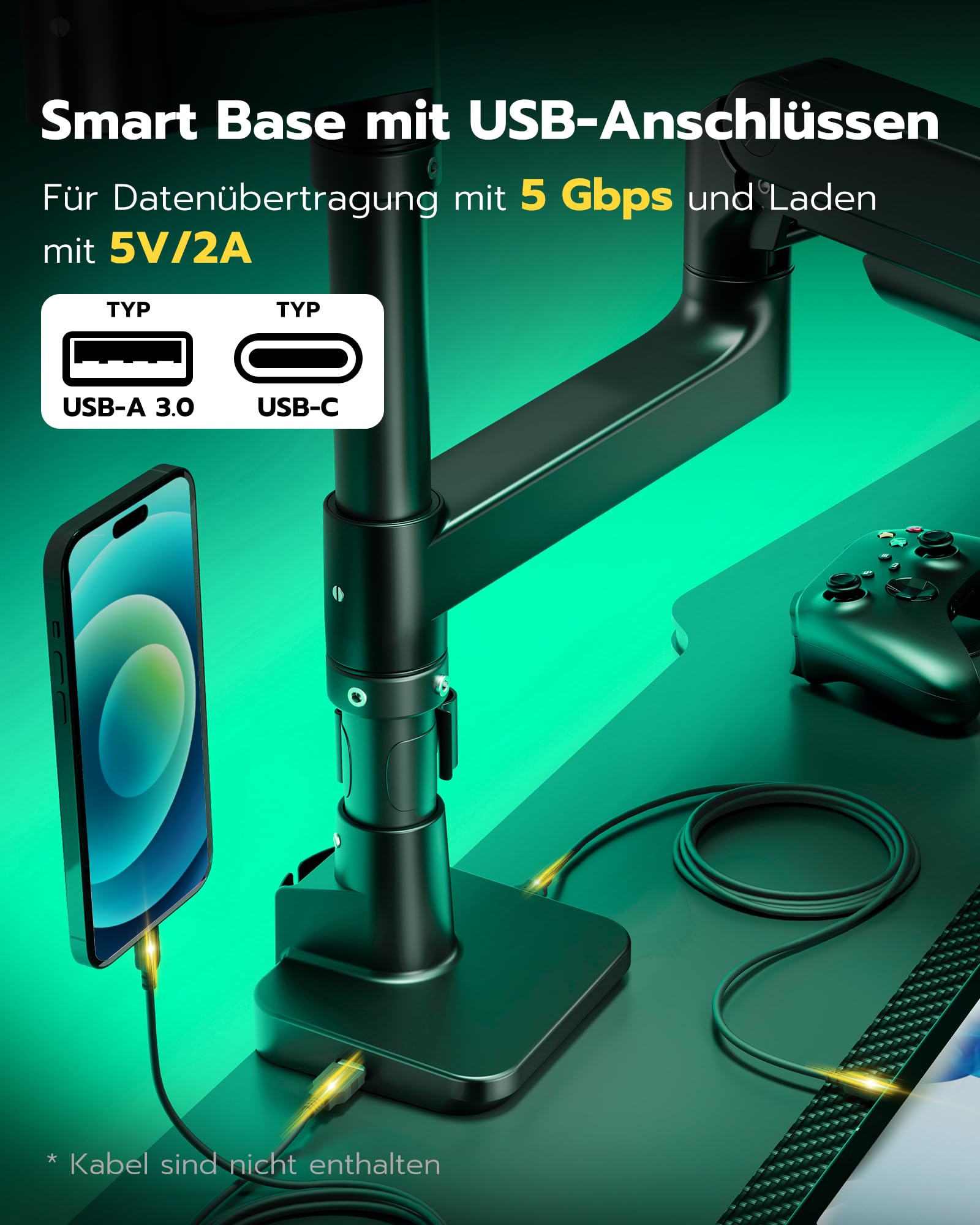 Die Basis der Halterung fungiert als praktische Ladestation. Mit je einem integrierten USB-A- und USB-C-Anschluss (5V/2A) können Sie Ihr Smartphone, Tablet oder andere Geräte bequem direkt am Arbeitsplatz aufladen, ohne ein zusätzliches Netzteil suchen zu müssen. Das sorgt für mehr Ordnung und Komfort.
