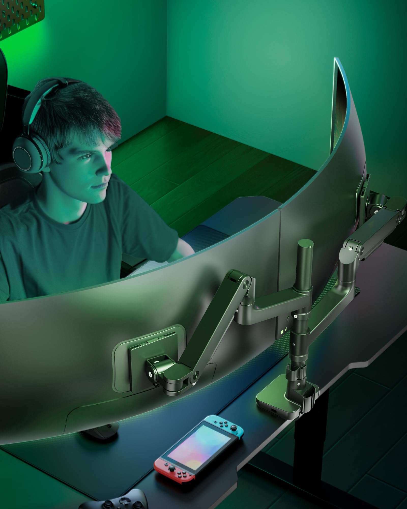 Verwandeln Sie Ihren Arbeitsplatz mit der ARES WING Monitorhalterung in eine ergonomische und aufgeräumte Kommandozentrale. Diese Halterung wurde speziell dafür entwickelt, zwei Monitore sicher und flexibel übereinander zu positionieren, und schafft so wertvollen Platz auf Ihrem Schreibtisch.