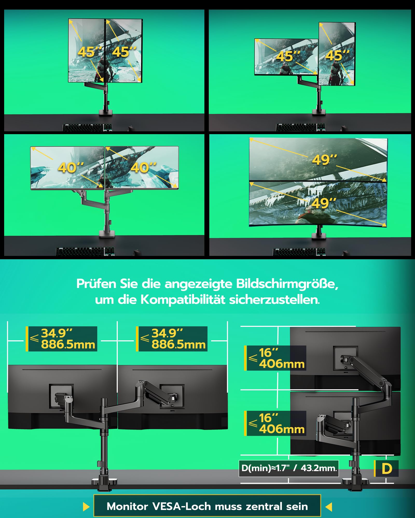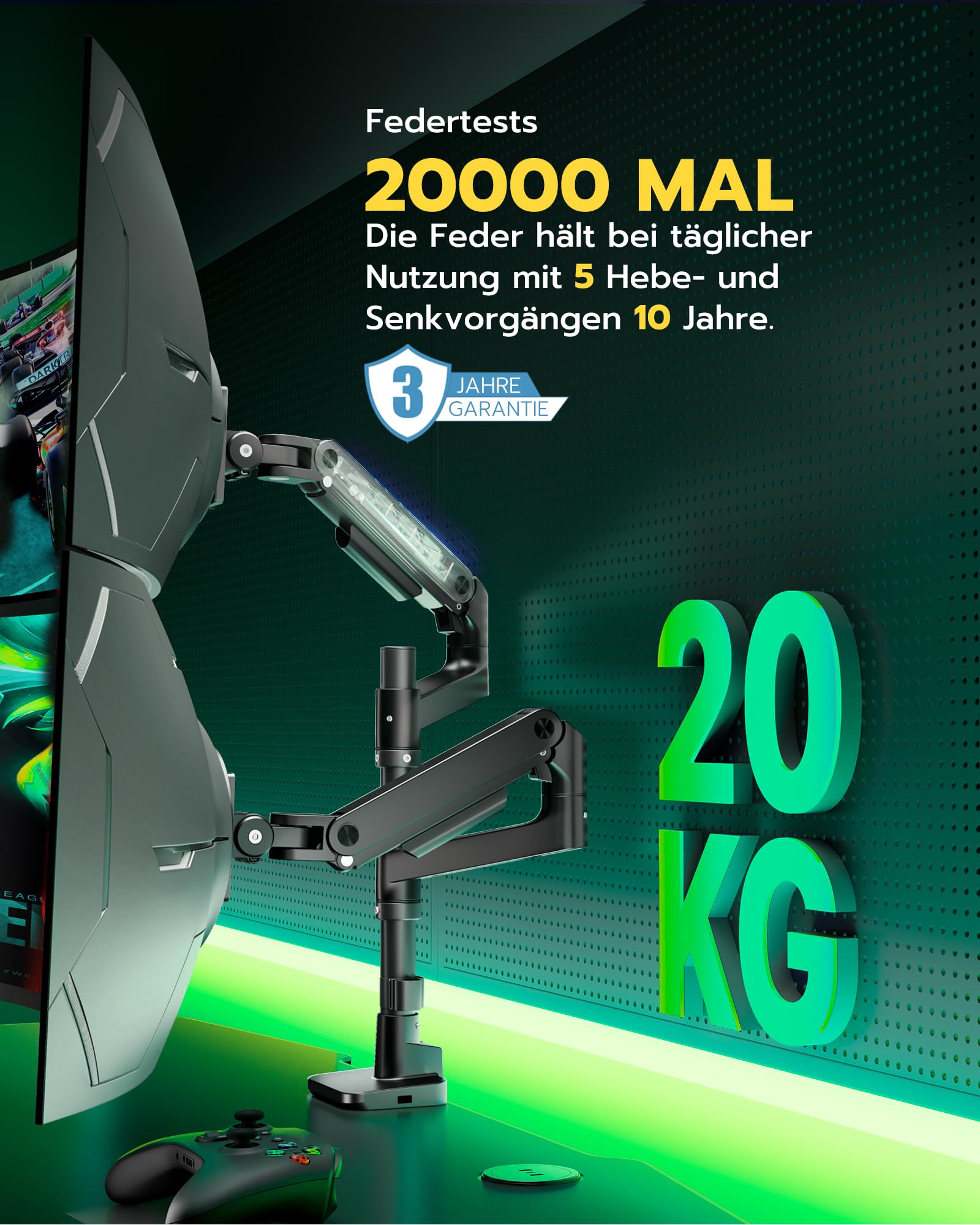 - Stabile Konstruktion: Gefertigt aus einer hochwertigen Aluminium-Stahl-Legierung, trägt jeder Arm problemlos Monitore mit einem Gewicht von 2 bis 20 kg.