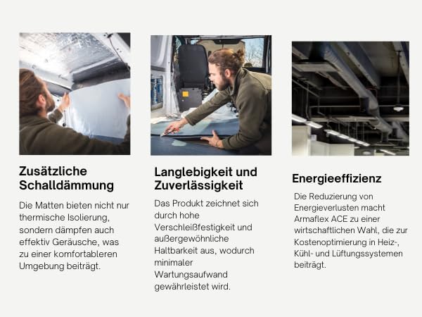 Dank ihrer Flexibilität, thermischen Isolierung und Schalldämmung eignen sie sich hervorragend für den Ausbau von Fahrzeugen wie Campern und Transportern, zur Isolierung von Rohrleitungen, Klimaanlagen und in allen Bereichen, wo sowohl Wärme- als auch Schallschutz gefordert ist.