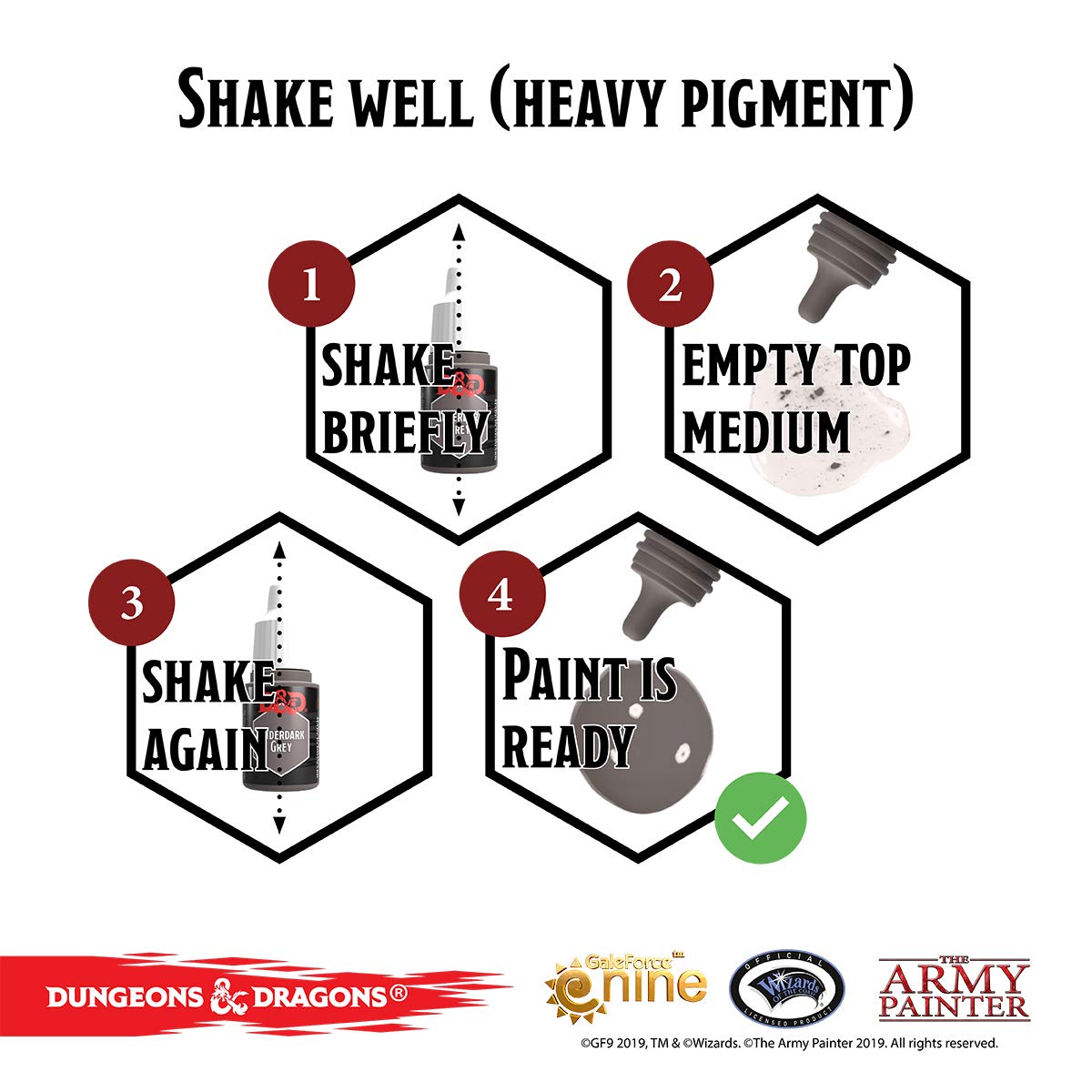 Die Farben von The Army Painter sind für ihre hohe Pigmentierung und hervorragende Deckkraft bekannt. Für das Bemalen mit dem Pinsel sind sie direkt aus der Flasche verwendbar. Für die Nutzung mit einer Airbrush wird eine leichte Verdünnung empfohlen, um erstklassige, glatte Ergebnisse zu erzielen.