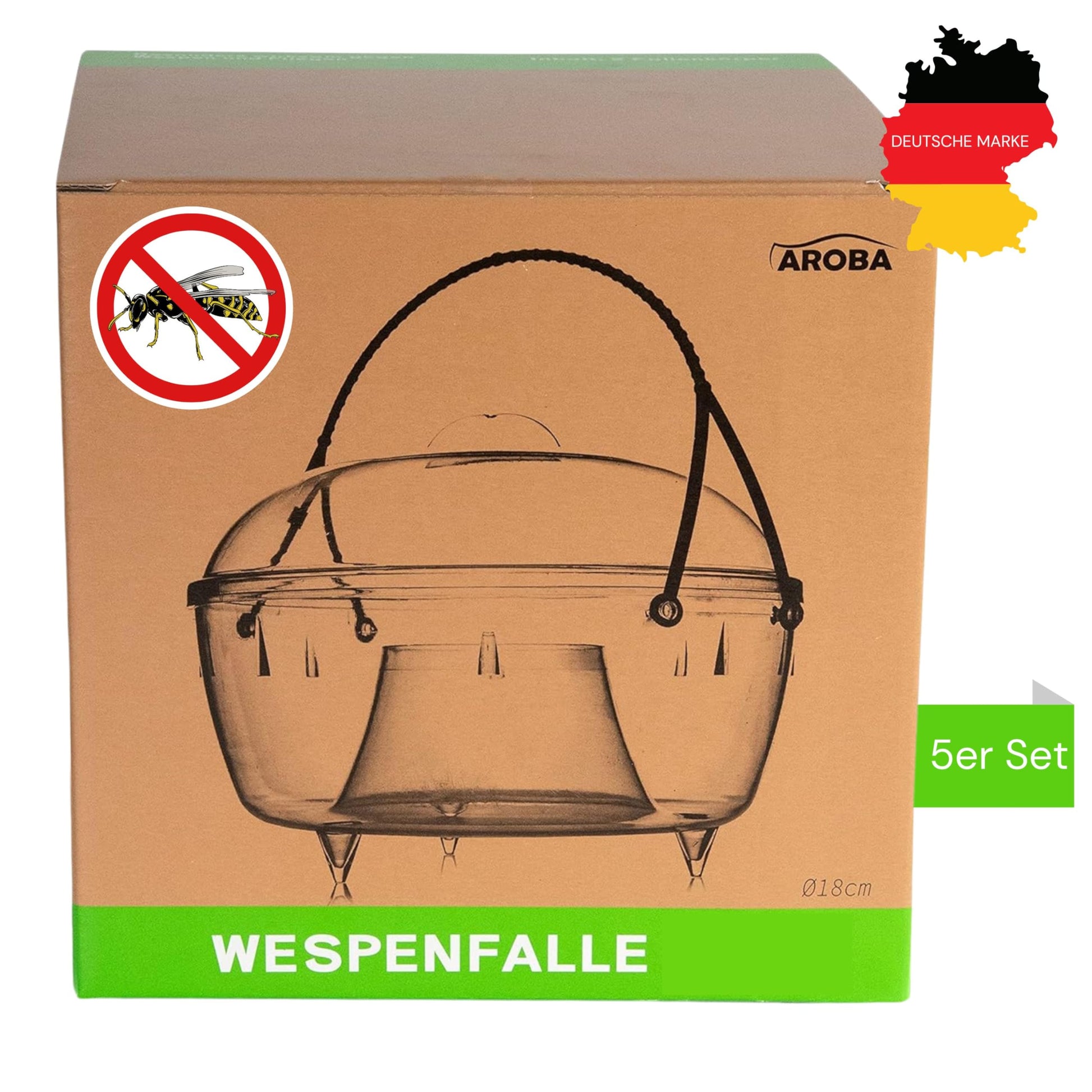 Sie erhalten ein Set mit 5 kompletten Wespenfallen der Marke AROBA (Modell ARWEFA5), jeweils mit einem grossen Durchmesser von 18 cm. Das Set eignet sich ideal, um einen grossen Garten, eine Terrasse oder einen Campingbereich umfassend und aus verschiedenen Richtungen zu schützen.