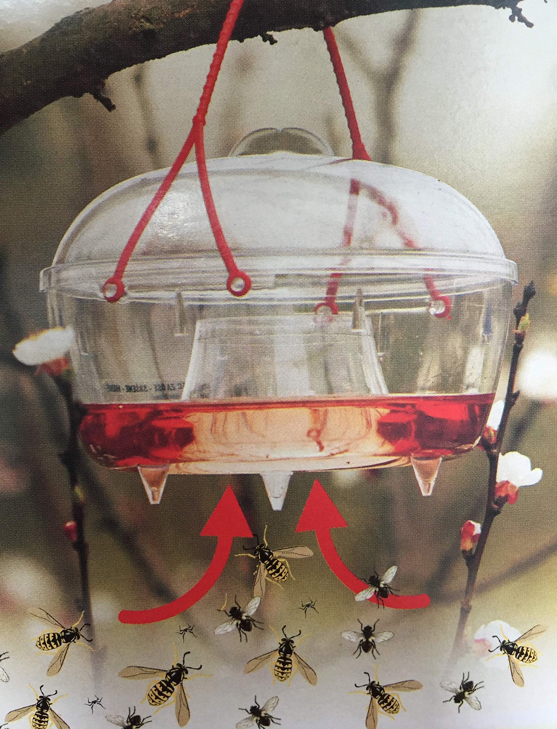 Der Lockstoff ist nicht enthalten, damit Sie flexibel bleiben. Eine sehr wirksame und bienenfreundliche Mischung besteht aus Zuckerwasser oder Fruchtsaft, Bier und einem Schuss Essig. Der Essig sorgt dafür, dass nützliche Bienen und Hummeln nicht angelockt werden.