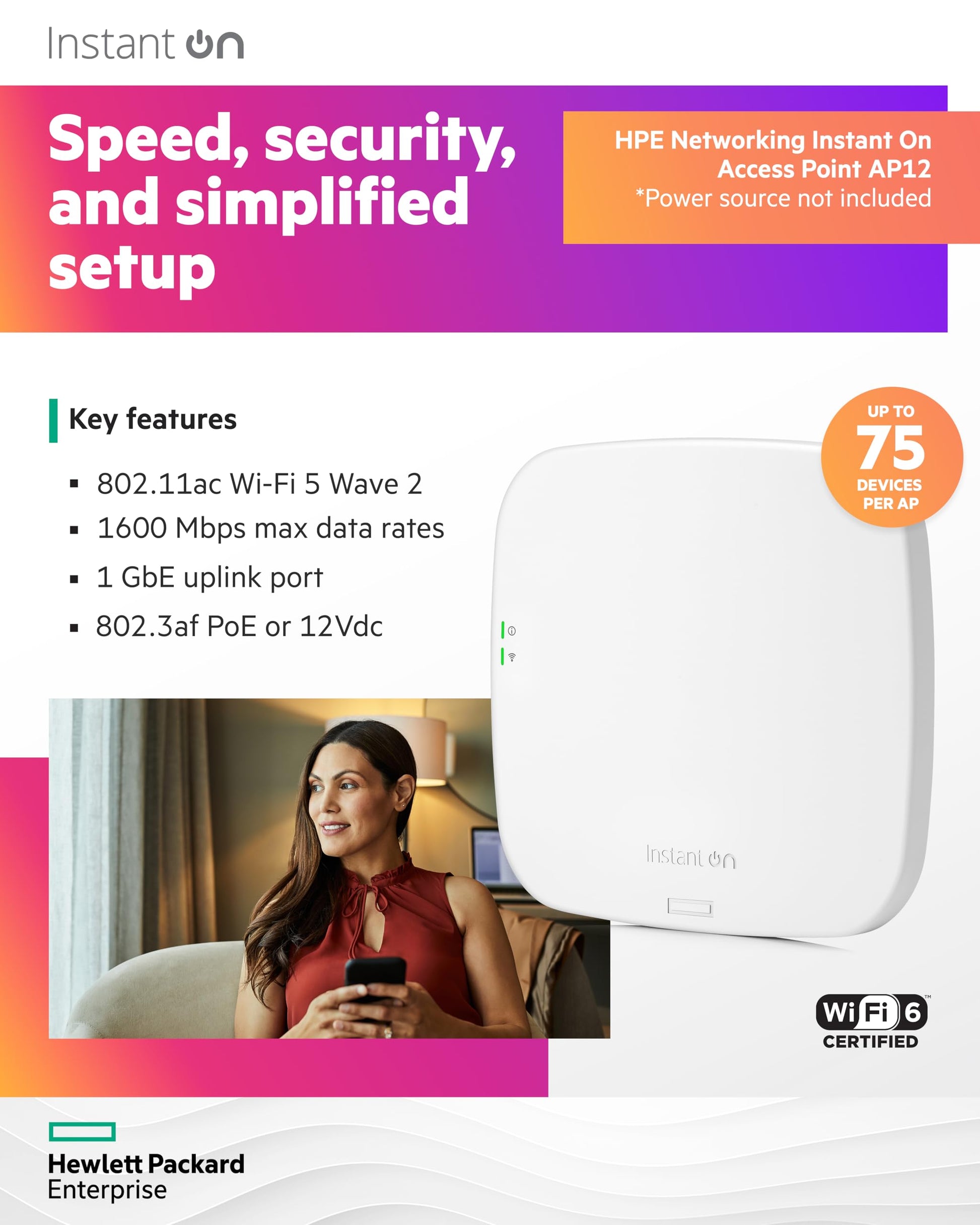 Der Aruba Instant On AP12 ist für den gleichzeitigen Betrieb von bis zu 75 aktiven Geräten pro Access Point ausgelegt, was ihn perfekt für Umgebungen mit moderatem Datenverkehr und einer Vielzahl von Smartphones, Laptops und IoT-Geräten macht.