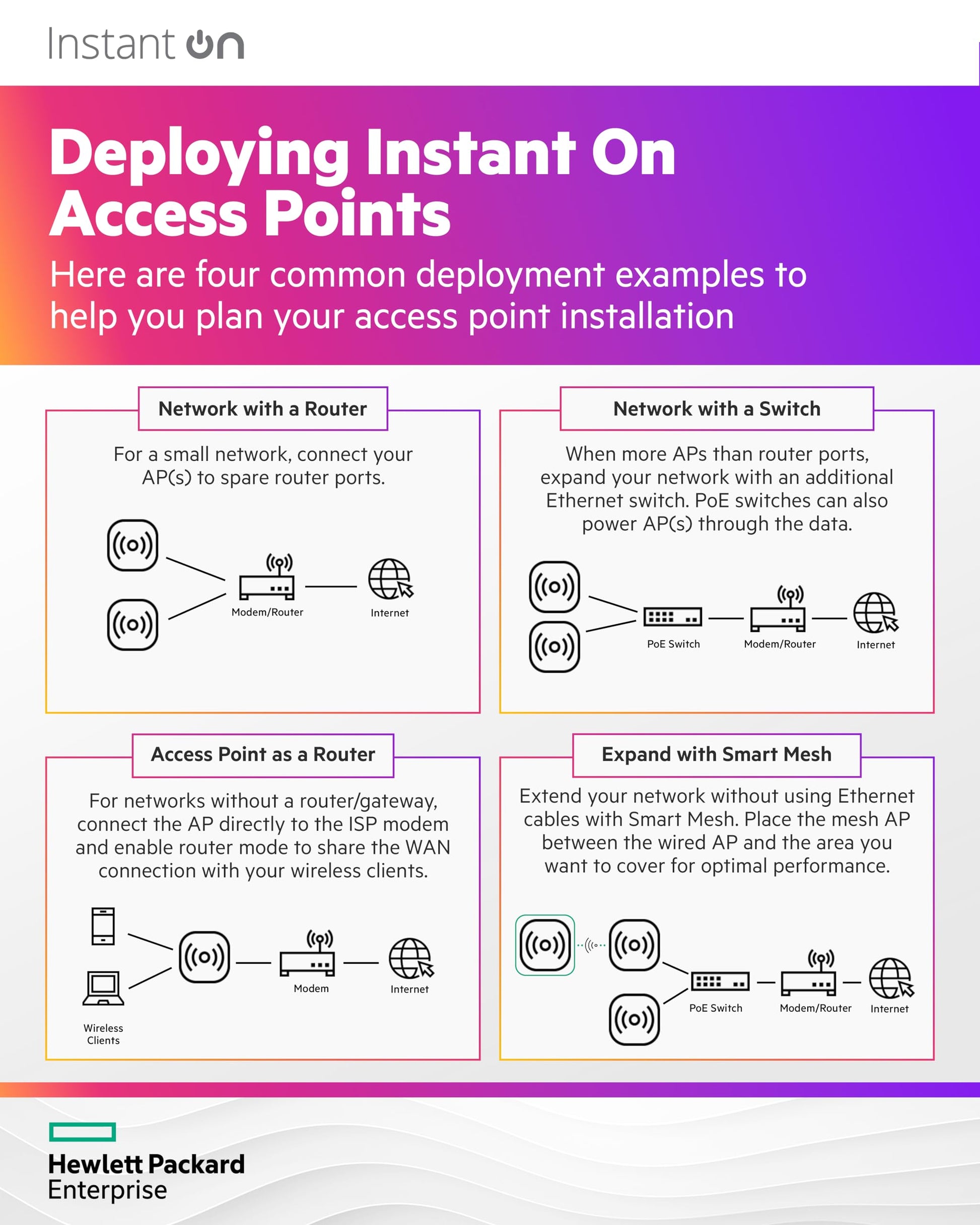 Mit der Smart Mesh-Technologie können Sie Ihre WLAN-Abdeckung ganz einfach erweitern. Fügen Sie weitere Instant On Access Points hinzu, um auch dort ein starkes Signal zu erhalten, wo keine Netzwerkkabel verfügbar sind.