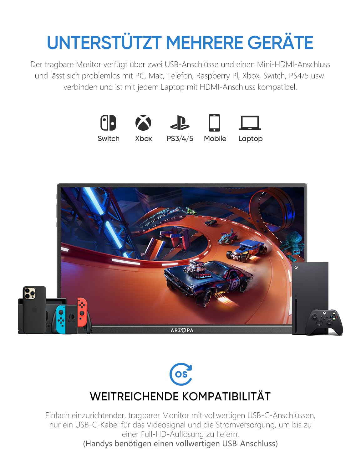 Der ARZOPA A1S ist vielseitig kompatibel und kann mühelos über seine Typ-C- oder Mini-HDMI-Anschlüsse mit den meisten Laptops (inkl. MacBooks), PCs, Macs, Spielkonsolen (PS3/4/5, Xbox, Switch) und anderen Geräten verbunden werden.