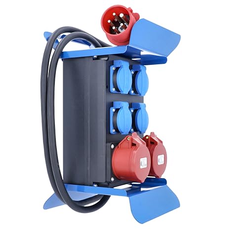 - Vielfältige Anschlüsse: Ein CEE-Eingangsstecker (400V/16A) versorgt vier Schutzkontakt-Steckdosen (230V) und zwei weitere CEE-Steckdosen (400V/16A) mit Klappdeckeln.