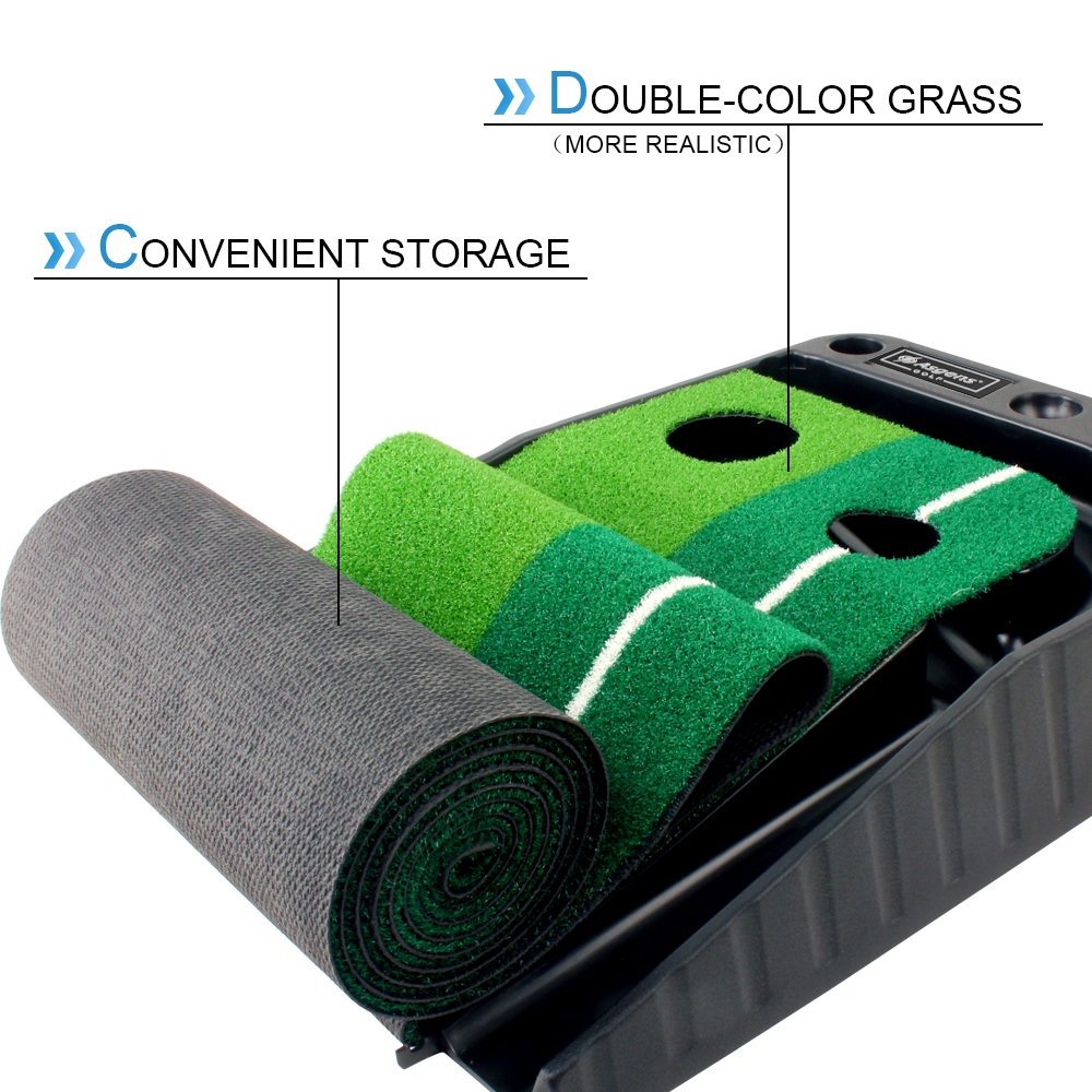 - Realistischer Kunstrasen: Die Matte verfügt über einen zweifarbigen Rasen, der echtes Grün authentisch simuliert. Eine strapazierfähige und rutschfeste Unterseite sorgt für maximale Stabilität bei jedem Putt.