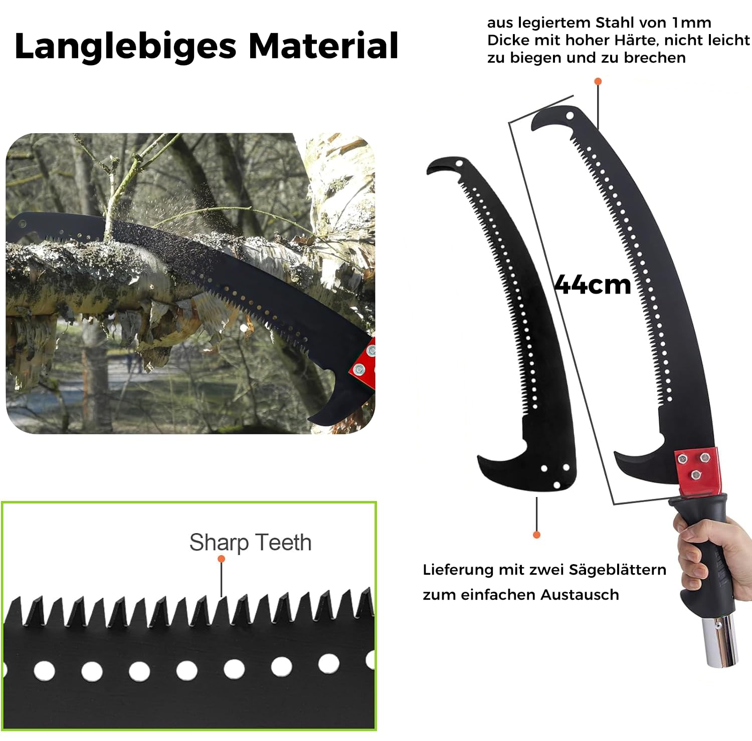 - Hochwertige Materialien: Die Stangen bestehen aus leichtem und dennoch stabilem Epoxidharz, das korrosionsbeständig ist und eine hohe Tragfähigkeit aufweist. Das Sägeblatt aus legiertem Stahl und der Scherenkopf aus gehärtetem Karbonstahl garantieren Langlebigkeit und Schärfe.