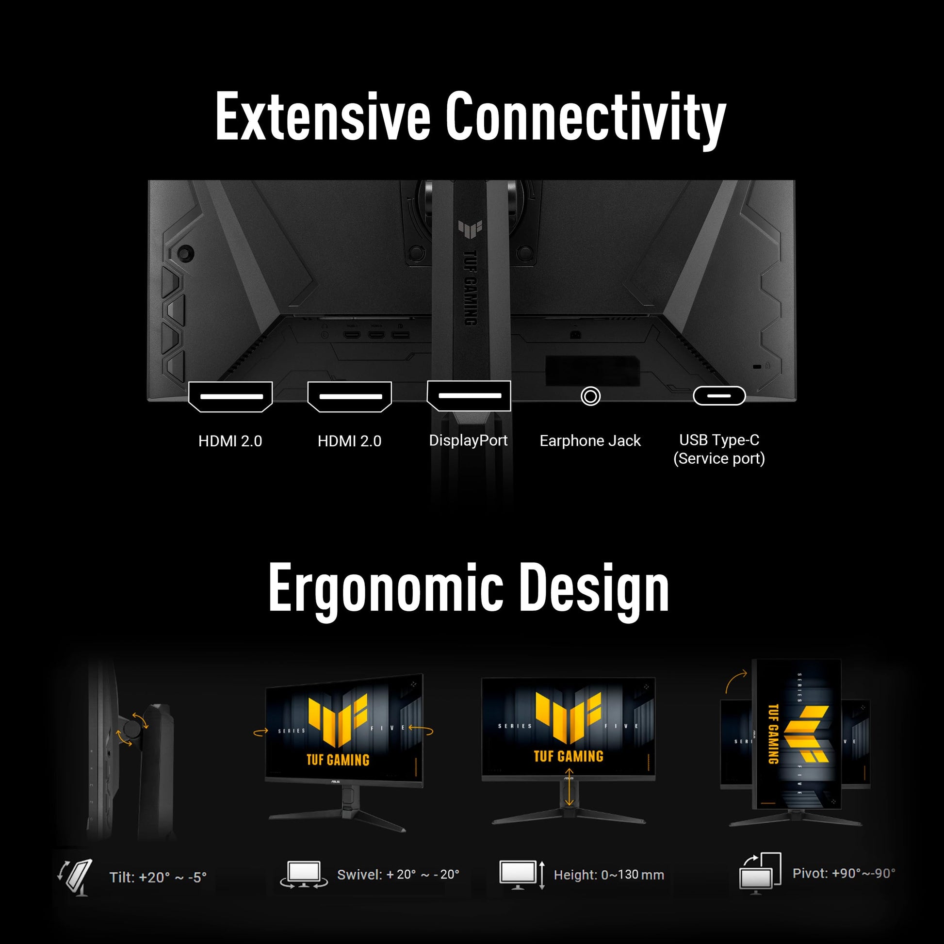 Der VG27AQL5A ist sehr flexibel ausgestattet und verfügt über DisplayPort, HDMI sowie einen integrierten USB-Hub zum einfachen Anschliessen von Peripheriegeräten. Zudem bietet der Stand umfassende ergonomische Einstellmöglichkeiten: Er ist höhenverstellbar, neigbar, schwenkbar und unterstützt die Pivot-Funktion (Hochformat).
