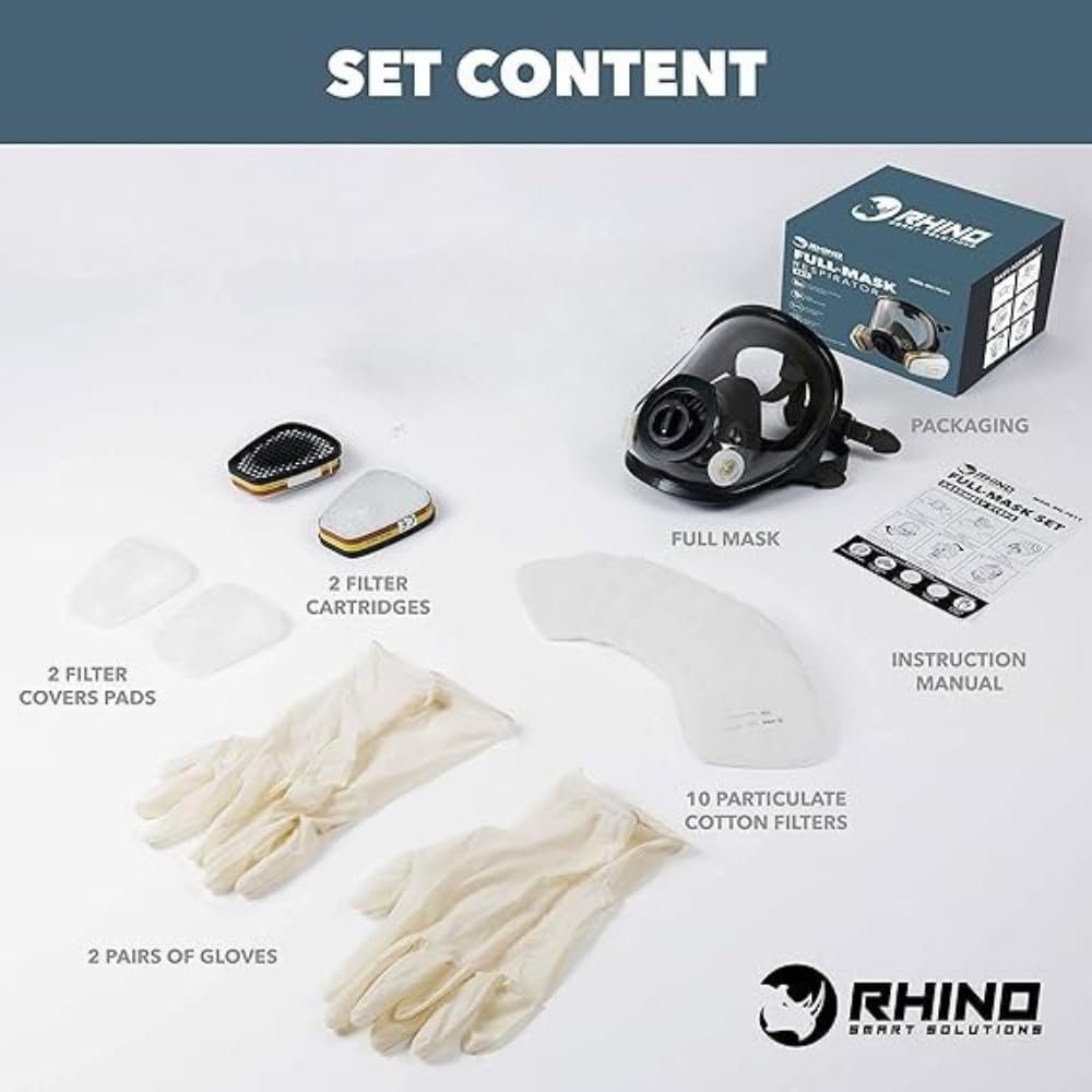 Sie erhalten ein sofort einsatzbereites Set, bestehend aus der Vollmaske, zehn Ersatz-Baumwollfiltern, zwei Filterkartuschen (P-A-1 für organische Dämpfe und P-E-1 für saure Gase), zwei Kartuschenabdeckungen, zwei Paar Schutzhandschuhen und einer Anleitung.