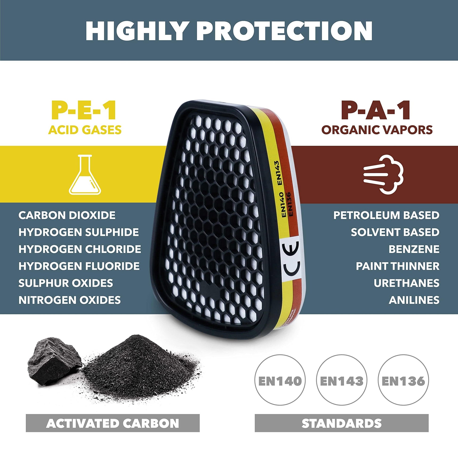 - Erhöhte Schutzwirkung: Die Kartuschen schützen effektiv gegen organische Dämpfe (P-A-1) und saure Gase (P-E-1), was zusammen mit den Aktivkohlefiltern einen besseren Schutz als bei herkömmlichen Masken bietet.