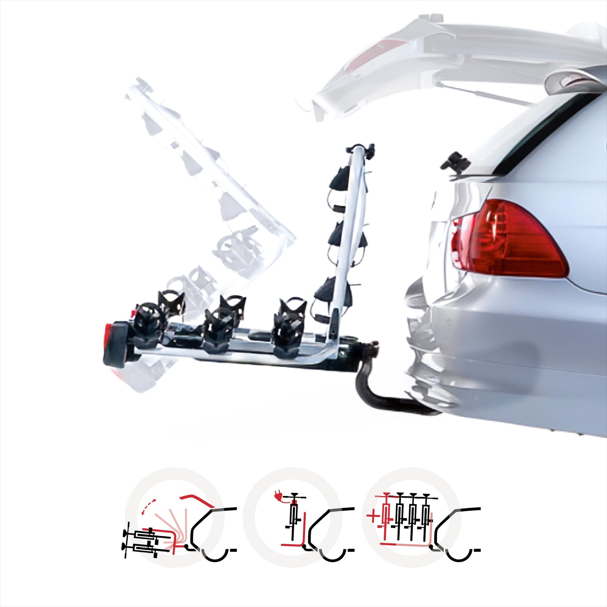 - Kapazität: Transportiert standardmässig 3 Velos und ist mit einer optionalen Schiene auf 4 Velos erweiterbar.