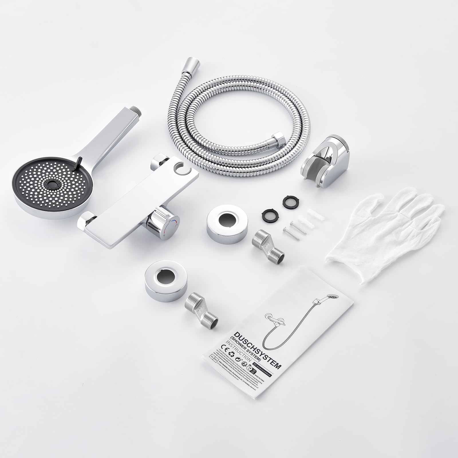 - Lieferumfang: Badewannenarmatur, Handbrause, Edelstahlschlauch, Wandhalterung, komplettes Montagezubehör, Anleitung