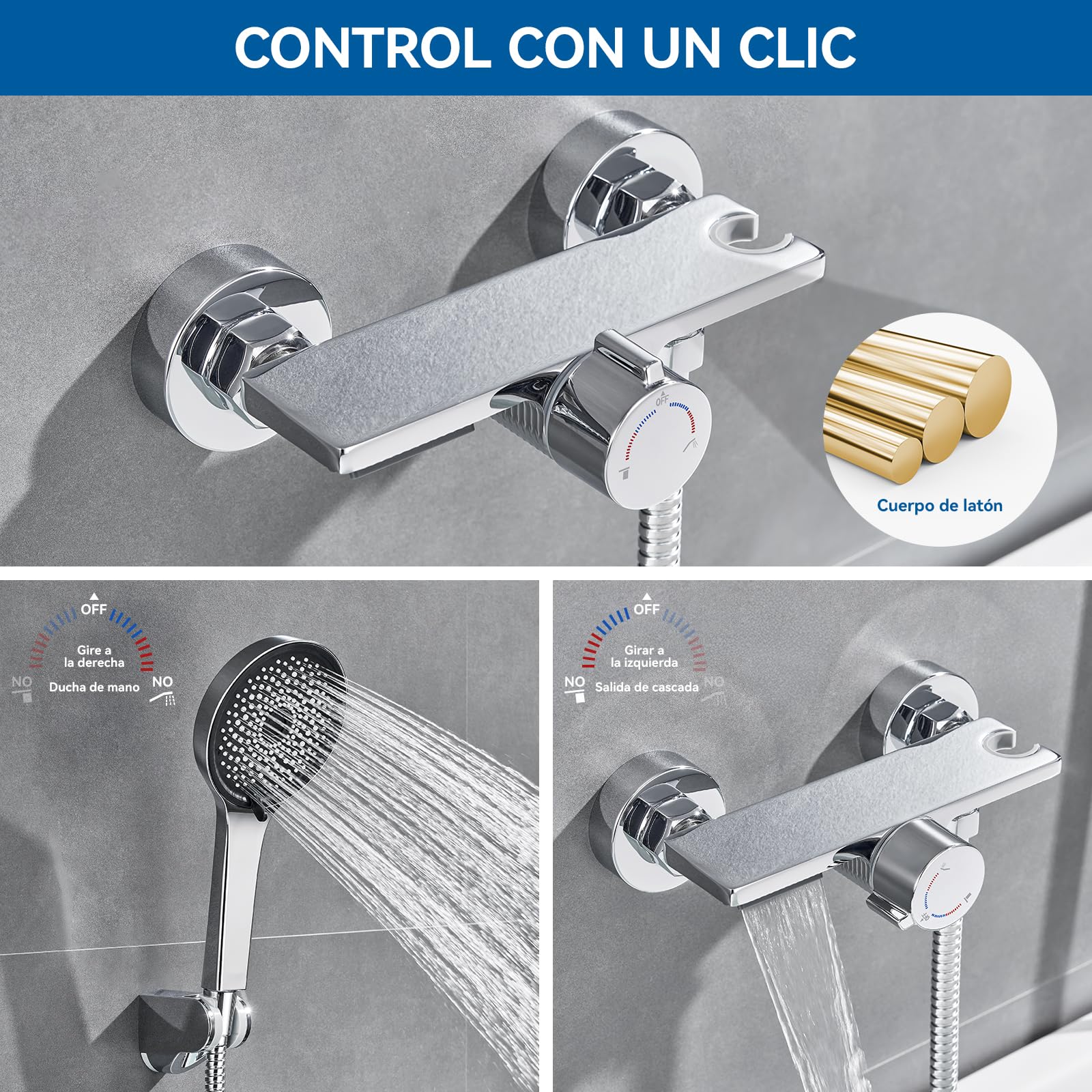 - Intuitive Zwei-Wege-Steuerung: Ein einziger Griff steuert alles. Eine Drehung nach links aktiviert den Wasserfall-Einlauf für die Wanne, eine Drehung nach rechts schaltet auf die Handbrause um. Die Temperatur lässt sich dabei stufenlos von kalt bis heiss regeln.
