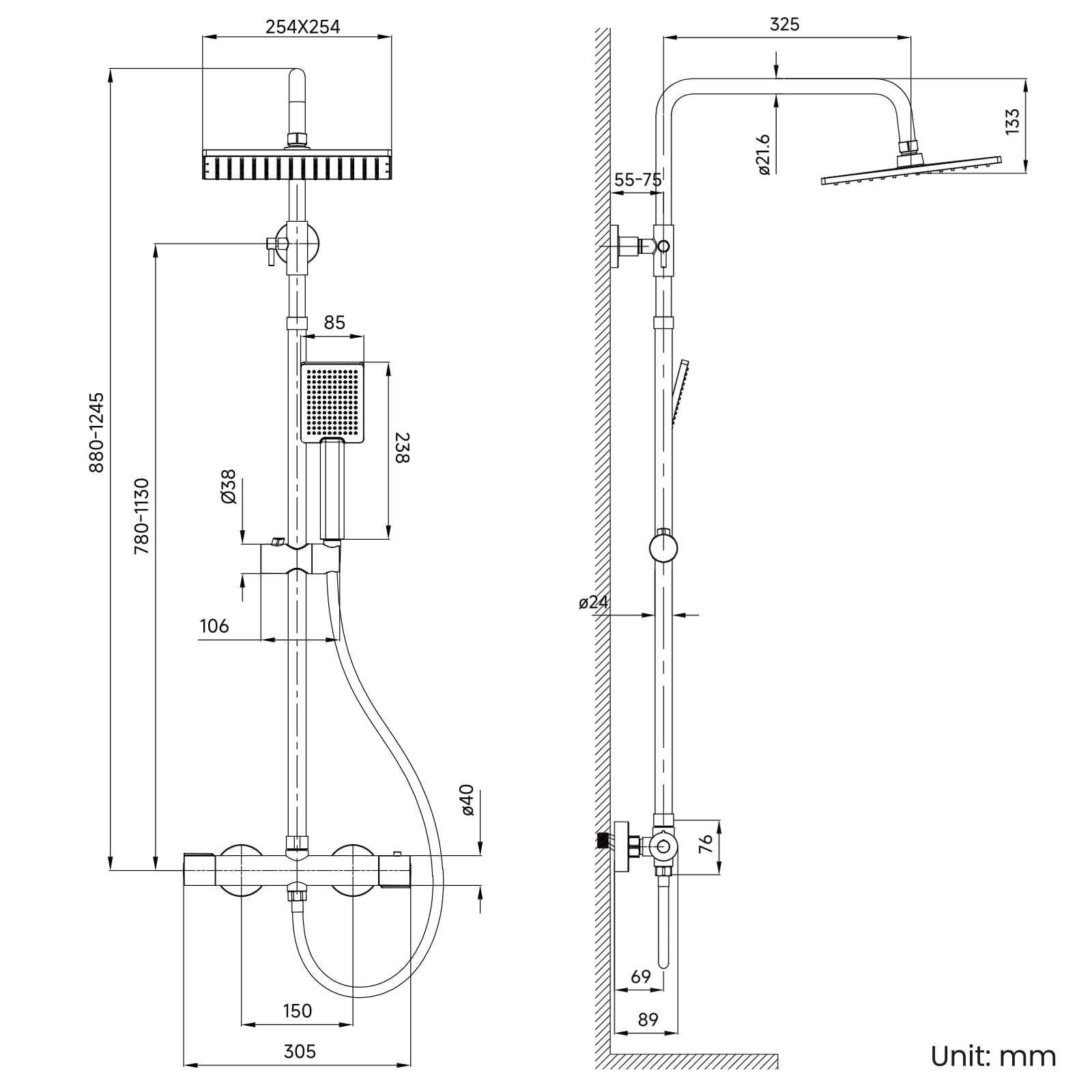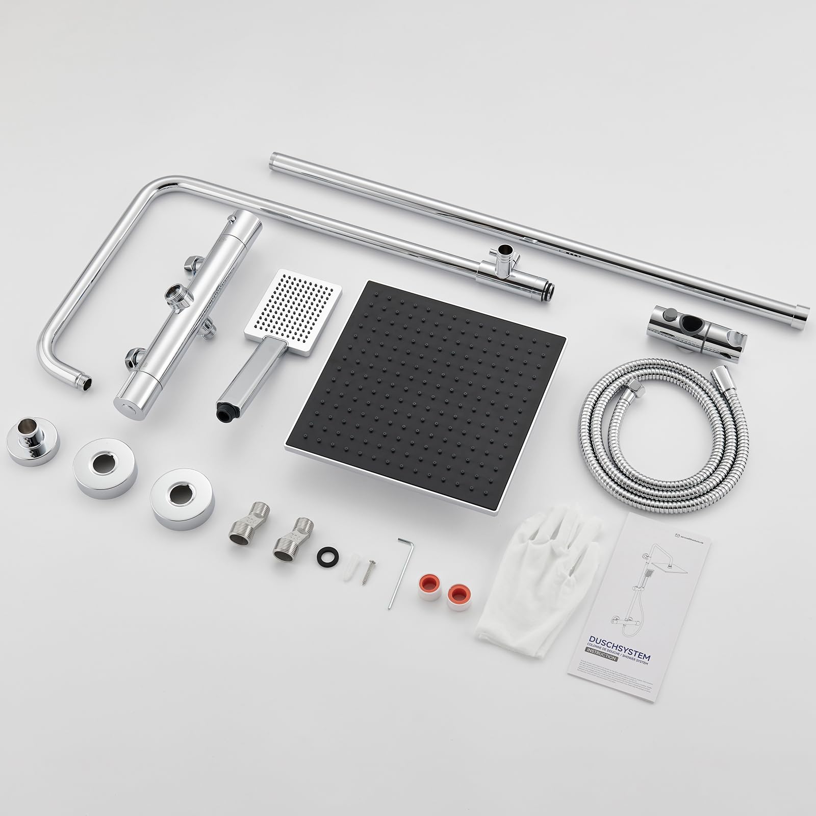 - Lieferumfang: Thermostat-Armatur, Regendusche (25x25cm), Handbrause, Duschstange, Duschschlauch, Handbrause-Halterung und komplettes Installationszubehör.