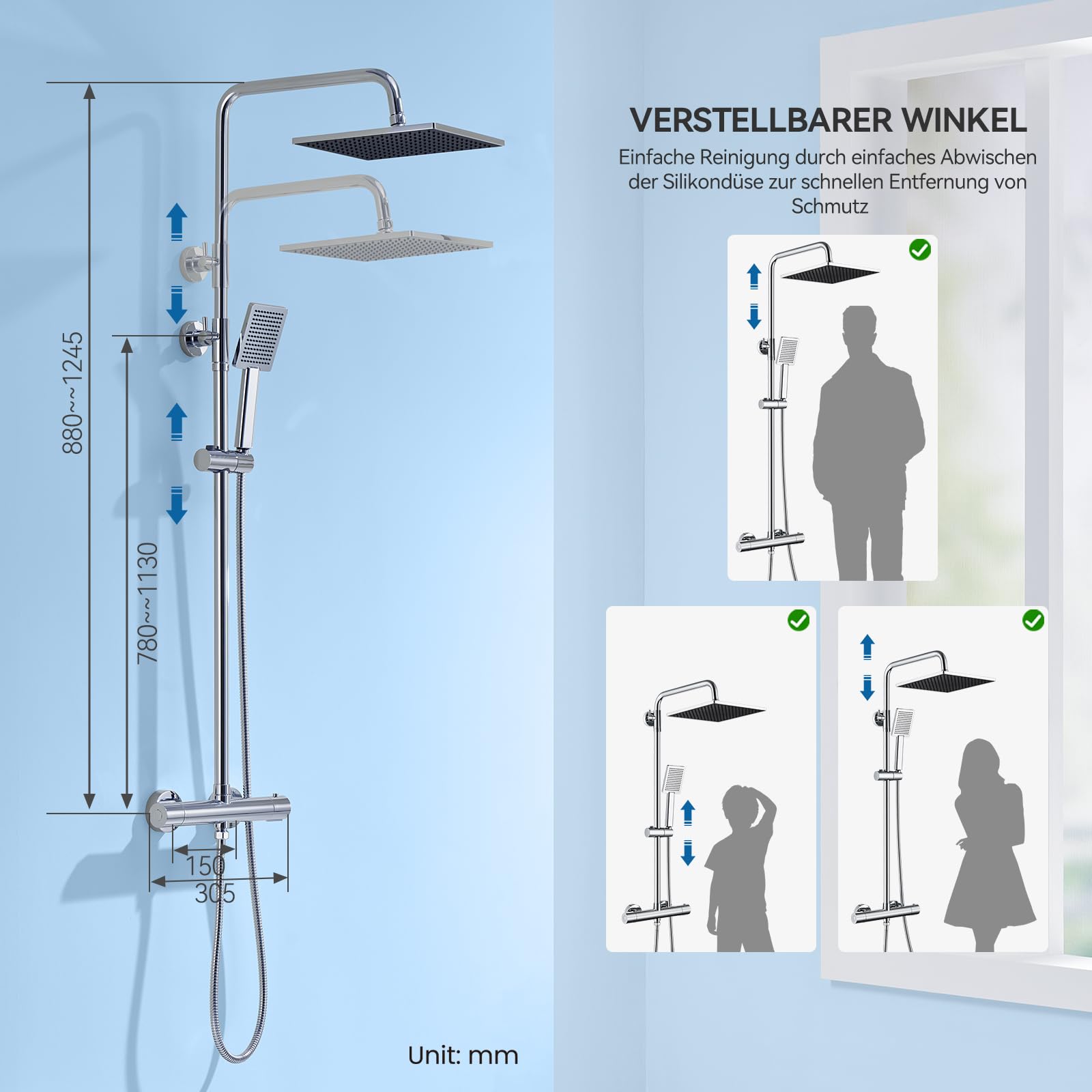 - Höhenverstellbare Duschstange aus Edelstahl (880–1245 mm)