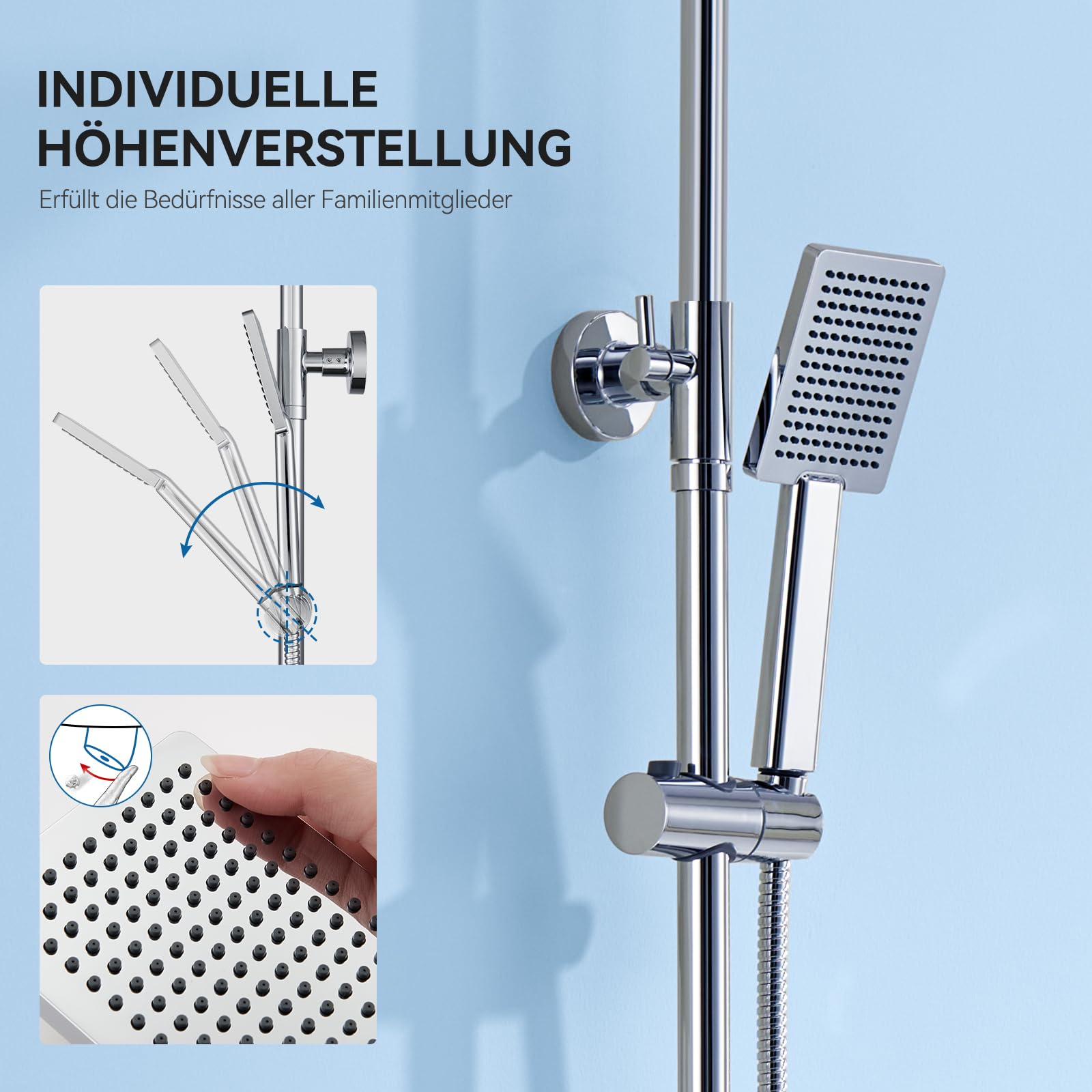 Die Pflege ist sehr einfach. Sowohl die grosse Regendusche als auch die Handbrause sind mit Anti-Kalk-Silikondüsen ausgestattet. Kalkablagerungen können Sie einfach mit den Fingern oder einem Tuch wegrubbeln, um ein dauerhaft perfektes Strahlbild zu gewährleisten.