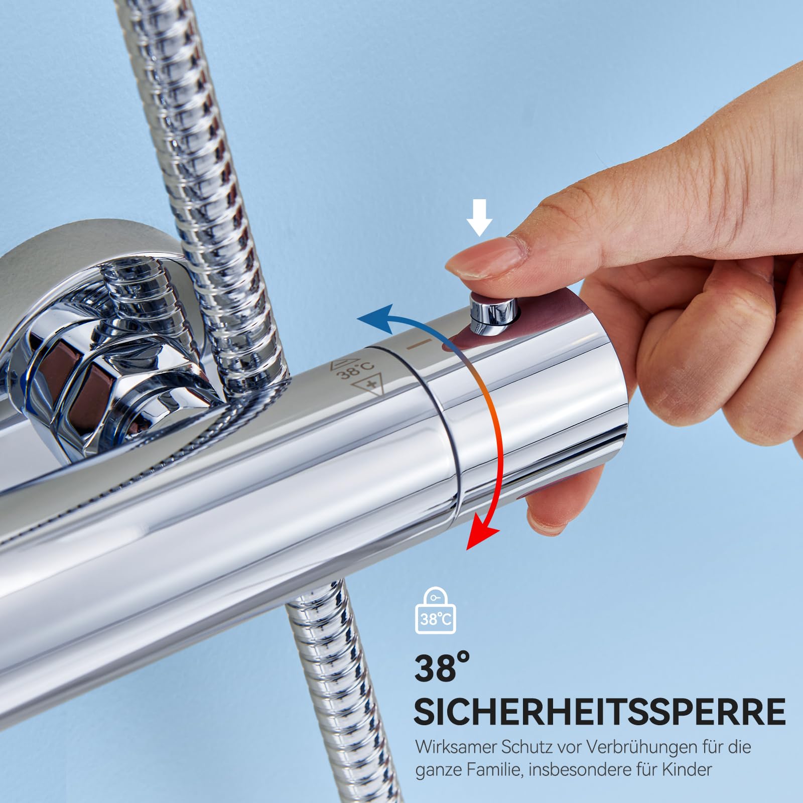 Sicherheit an erster Stelle: Der integrierte Verbrühschutz sorgt für eine konstant kühle Oberfläche der Armatur, während die 38-Grad-Sicherheitssperre zuverlässig vor zu heissem Wasser schützt. Geniessen Sie eine stets gleichbleibende Wunschtemperatur ohne plötzliche Schwankungen – für ein sicheres und entspanntes Duscherlebnis für die ganze Familie.