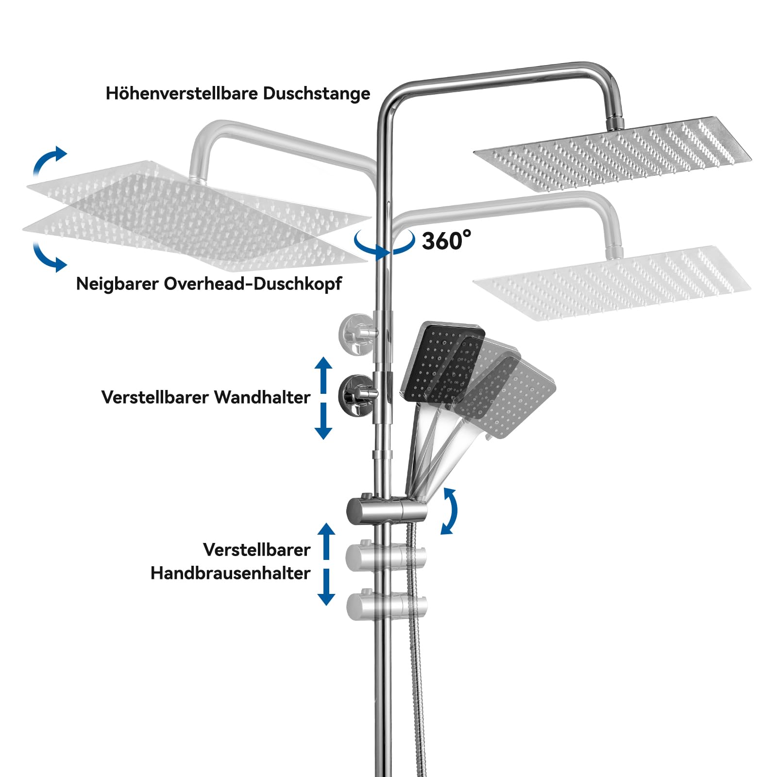 - Duschstange: Höhenverstellbar von 880 mm bis 1240 mm