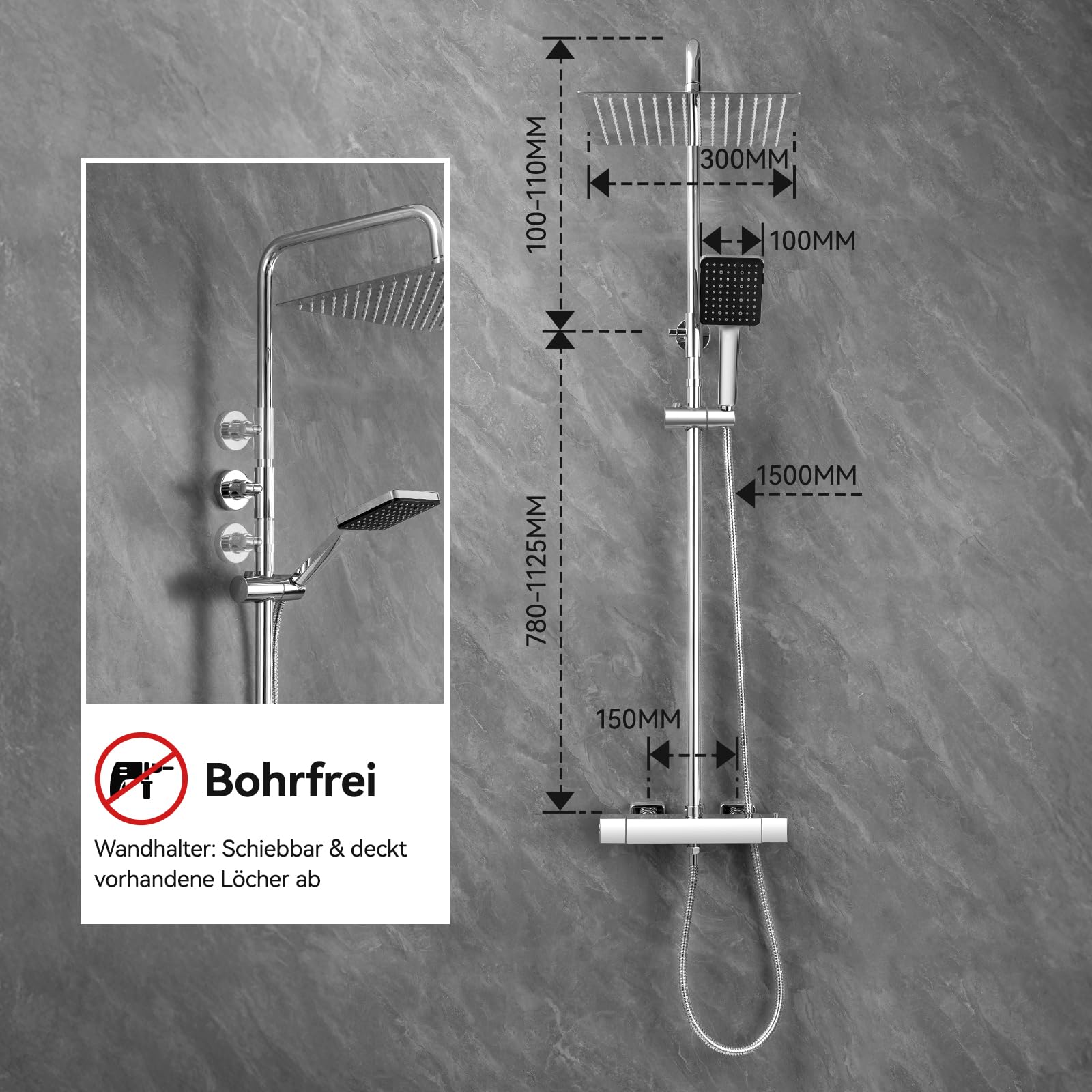 Einfache und flexible Montage: Die Duschstange aus rostfreiem Edelstahl lässt sich stufenlos in der Höhe verstellen. Dadurch können bestehende Bohrlöcher oft weiterverwendet werden, was eine Montage ohne neues Bohren ermöglicht und das Set perfekt für Renovationen und Sanierungen macht.