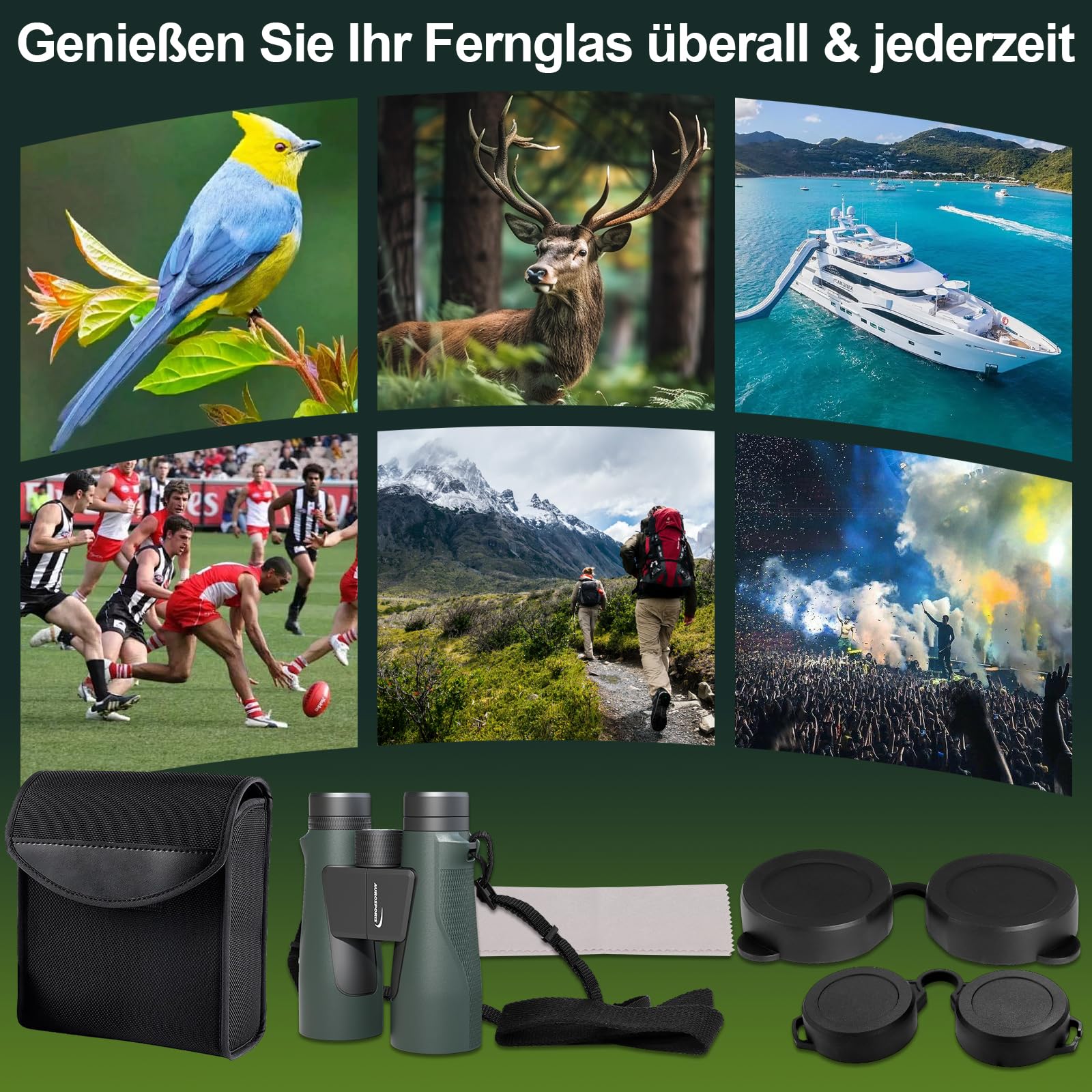 Dieses Fernglas ist ein wahrer Allrounder. Ob bei der Jagd, auf Wanderungen, auf Reisen mit dem Kreuzfahrtschiff oder zur Vogelbeobachtung – es ist stets ein verlässlicher Partner. Das nicht reflektierende Gehäuse fügt sich unauffällig in die Umgebung ein und macht Sie zu einem diskreten Beobachter. Das komplette Set enthält alles, was Sie für den sofortigen Start benötigen: eine Schutztasche, einen Trageriemen, ein Reinigungstuch und eine Anleitung.
