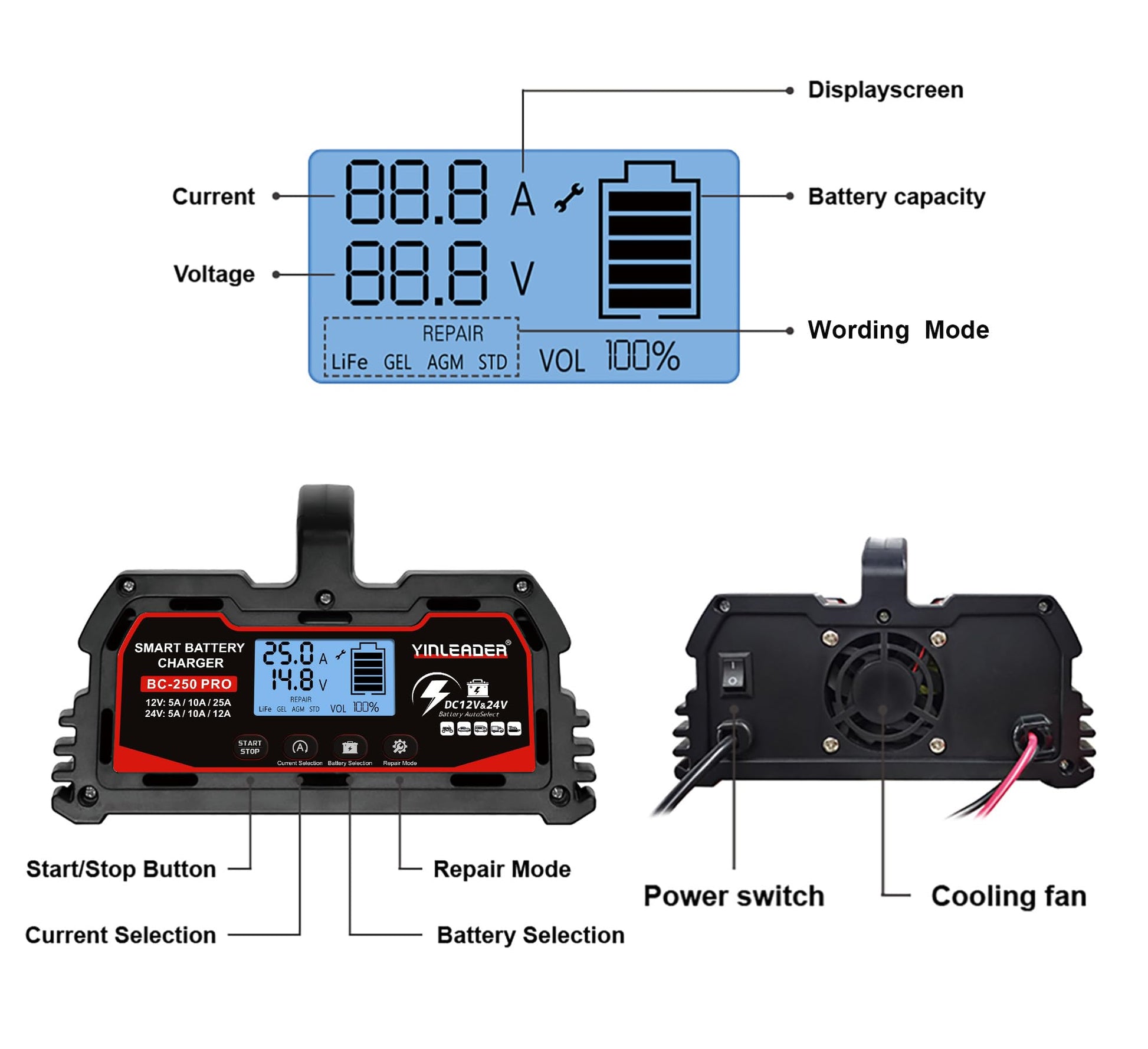 Es ist für nahezu alle gängigen 12V/24V Blei-Säure-Batterien (AGM, GEL, SLA, VRLA, Kalzium, Nass) von 2Ah bis 250Ah sowie für 12V LiFePO4-Akkus konzipiert. Bitte beachten Sie, dass es 24V LiFePO4-Batterien nicht unterstützt.