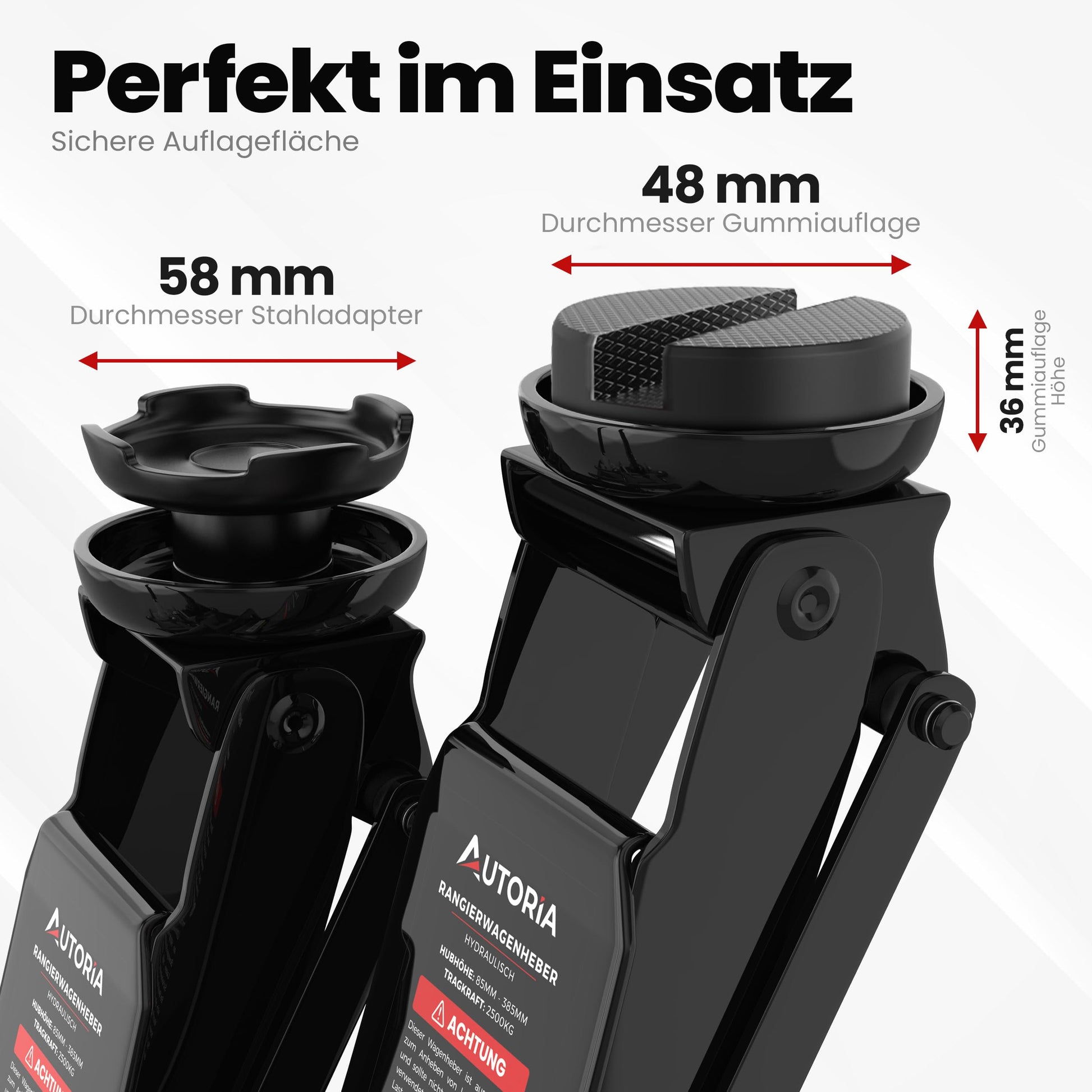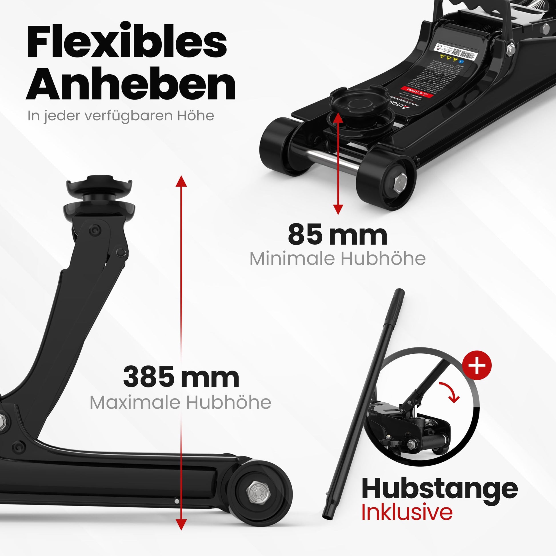 - Grosser Hubbereich: Hebt Ihr Fahrzeug sicher auf eine Arbeitshöhe von bis zu 385 mm.