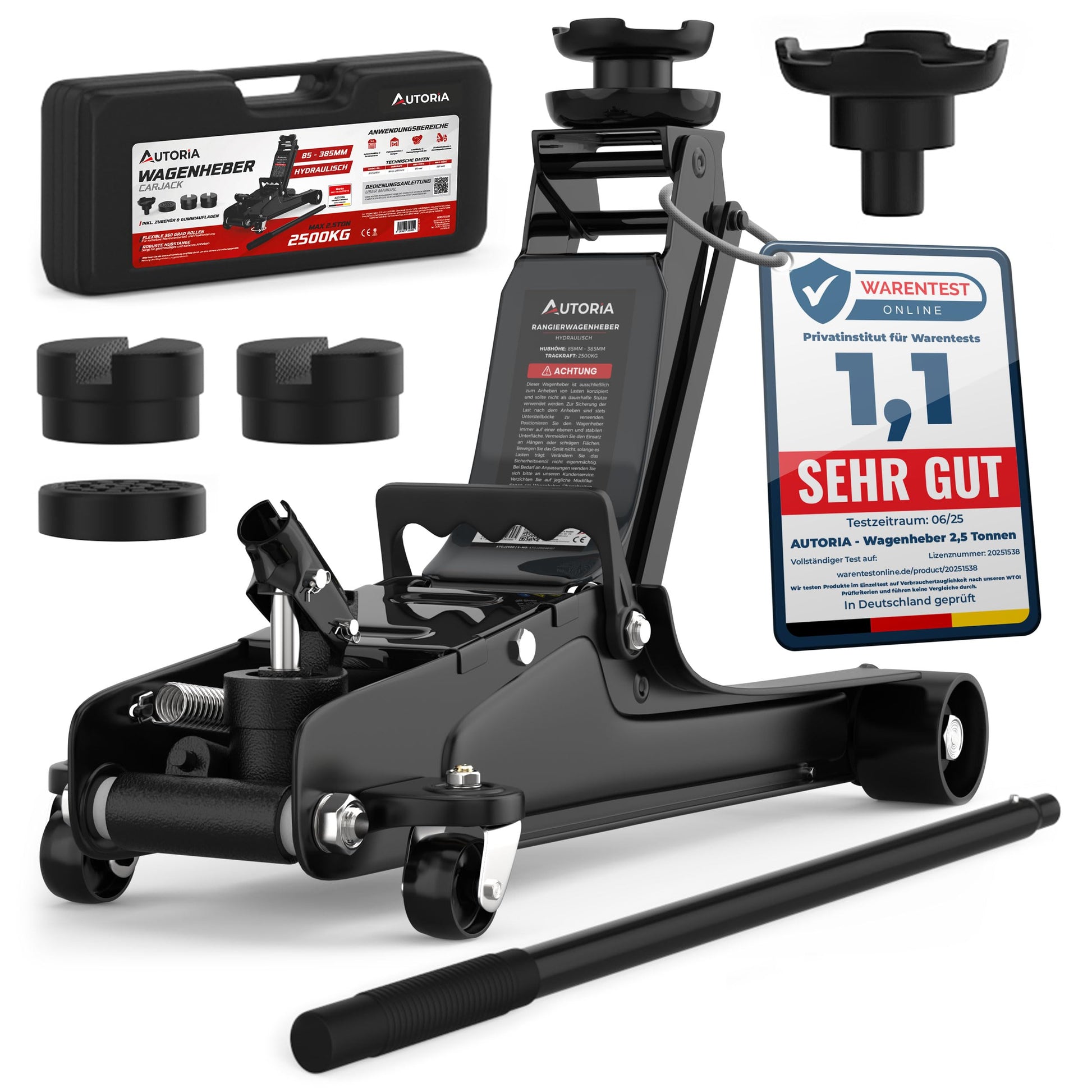 Sie erhalten ein komplettes Zubehör-Set, das alles für den sofortigen Einsatz enthält: den Wagenheber, 3 schützende Gummiauflagen zur Schonung des Fahrzeugs, einen Adapter sowie einen robusten Transportkoffer zur einfachen Lagerung und Mitnahme.