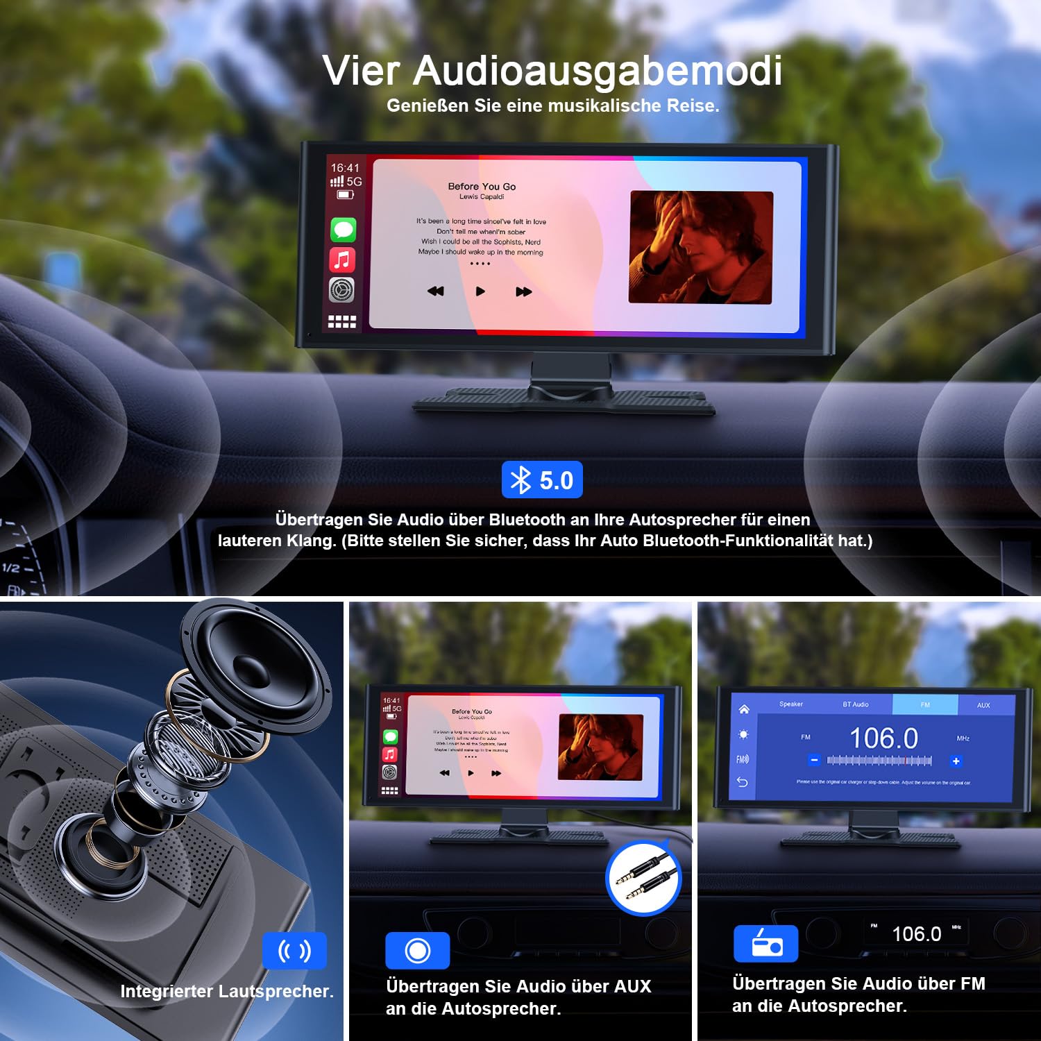 Sie haben vier Möglichkeiten für die Audio-Wiedergabe: Übertragen Sie den Ton per FM-Transmitter auf eine freie Radiofrequenz, verbinden Sie das Gerät via Bluetooth mit Ihrem Autoradio, nutzen Sie das mitgelieferte AUX-Kabel für eine verlustfreie Klangqualität oder verwenden Sie den integrierten Lautsprecher des Displays.
