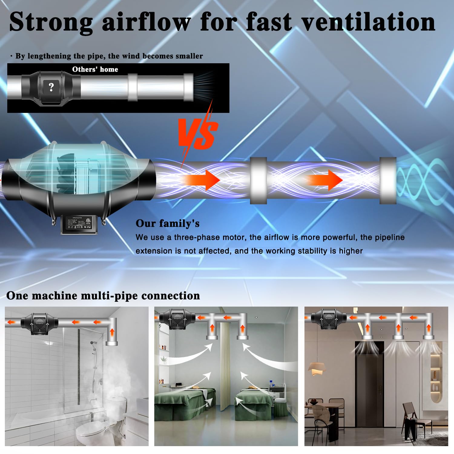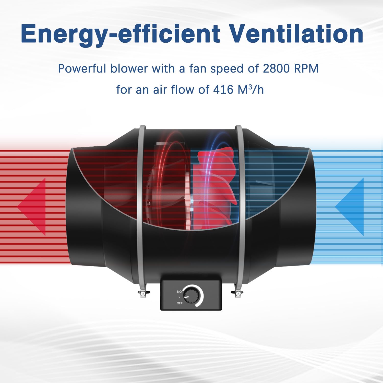 - Konstante Leistung: Gewährleistet einen Luftstrom von 416 m³/h bei 2800 U/min, selbst bei Rohrlängen von über 10 Metern ohne Leistungsabfall.